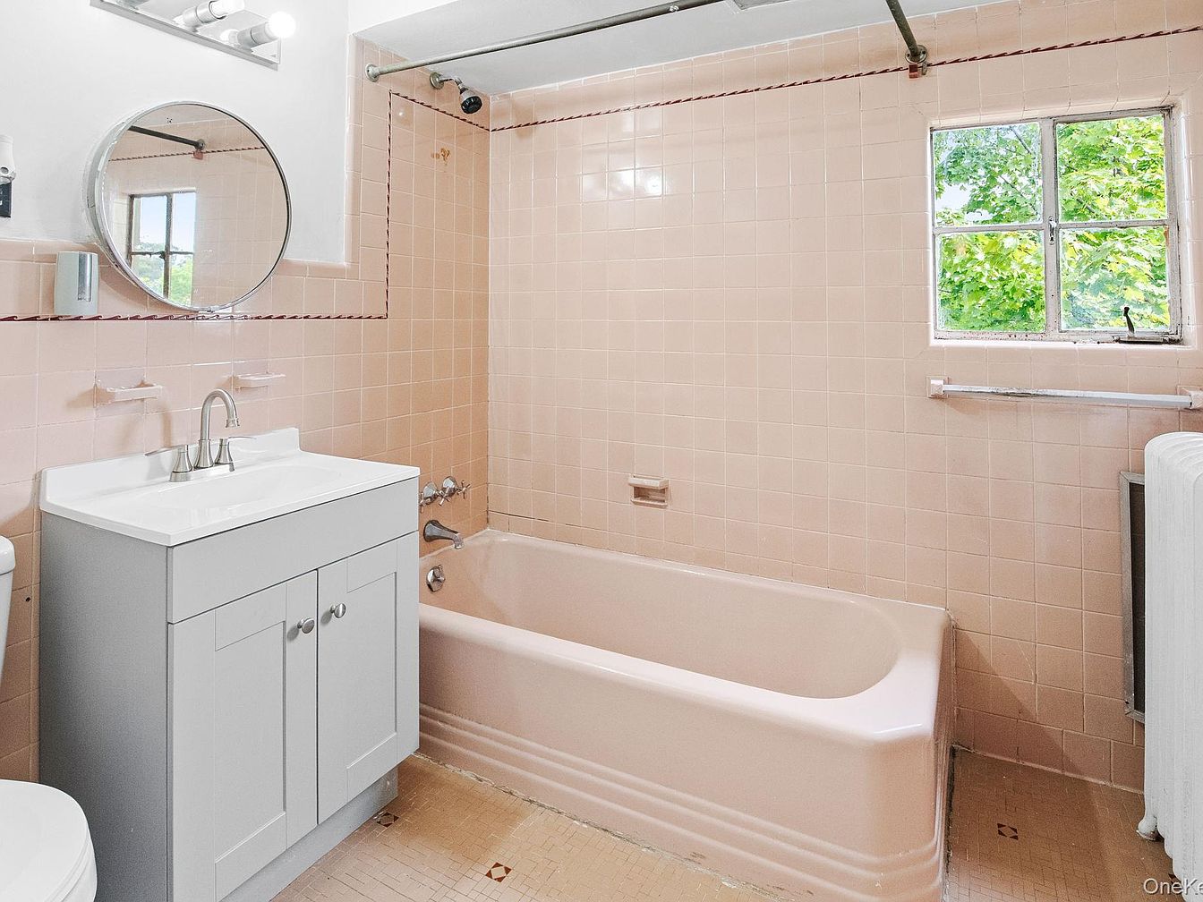 This bathroom features a charming vintage aesthetic with soft pink tiled walls and a coordinating pink bathtub. A compact, modern white vanity contrasts nicely with the vintage tones, adding a contemporary touch. A round mirror above the sink enhances the spacious feel and reflects natural light from the window, highlighting nearby greenery. Functional elements, such as a simple white toilet and a towel rack, contribute to the minimalist design. The floor showcases a classic pattern, tying the room together. Overall, the combination of retro colors with modern simplicity creates an inviting and warm atmosphere.