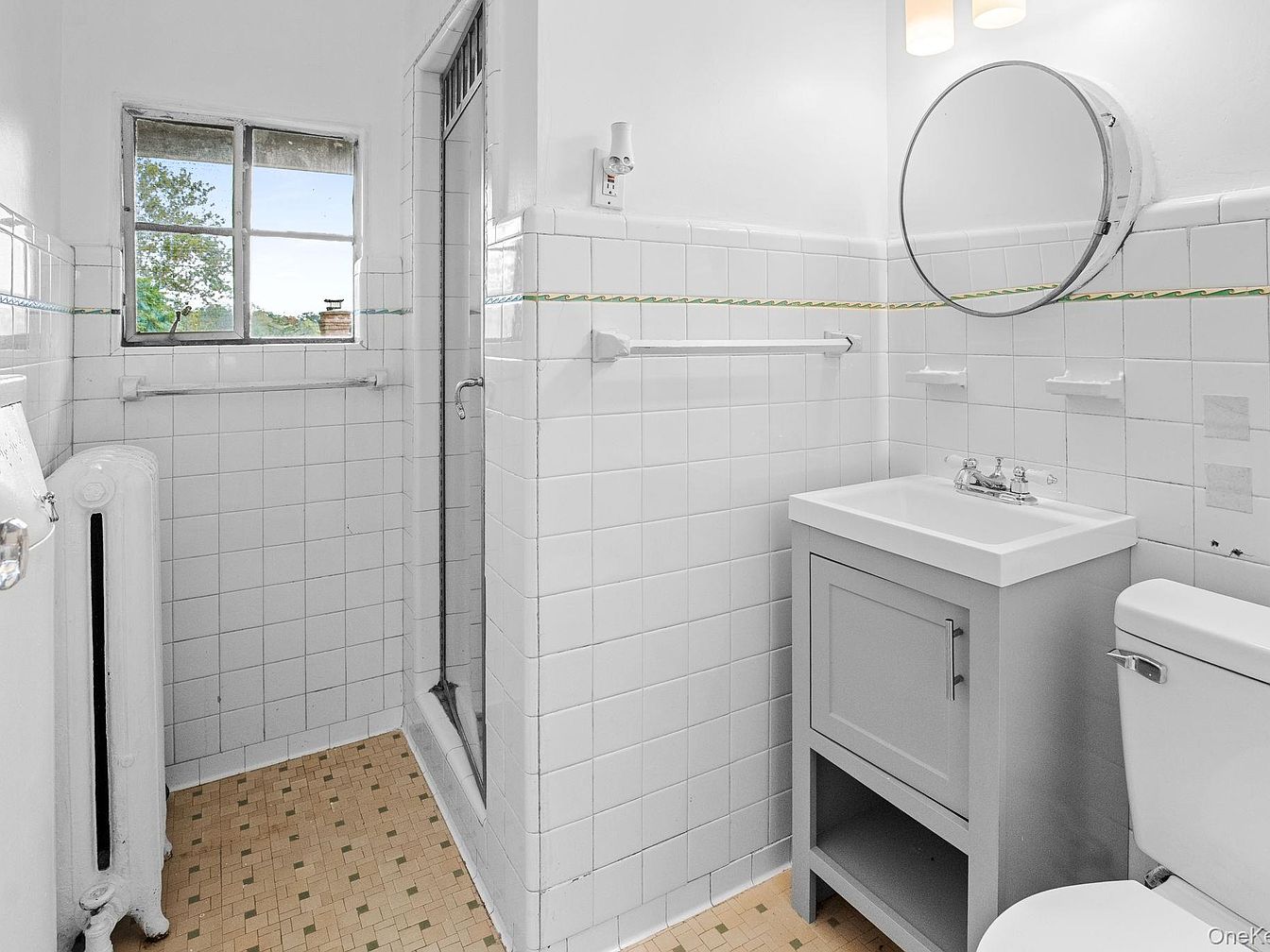 This compact bathroom features classic white tile walls with a subtle green pattern running horizontally. A frosted window provides natural light, framed by a simple wooden window sill. The light-colored floor tiles have a muted checkered design, adding a touch of vintage charm. A sleek, modern gray vanity with a white countertop holds a polished sink, while a round mirror reflects the room’s brightness. To the side, a clear glass shower enclosure complements the clean aesthetic. An old-fashioned radiator adds character, contrasting elegantly with the contemporary fixtures, creating a harmonious blend of old and new.