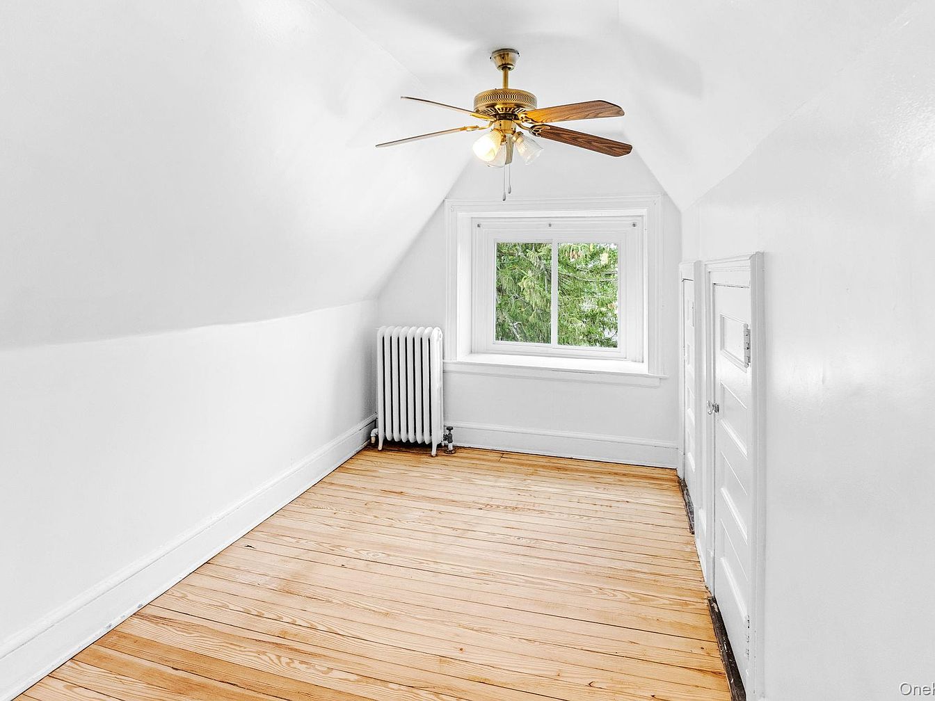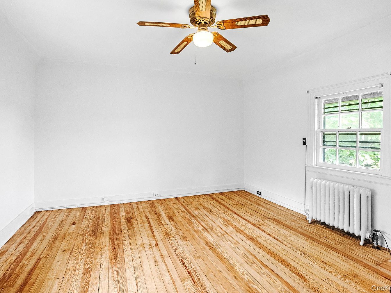 The image portrays a bright bedroom characterized by its spaciousness and simplicity. White walls create a fresh, airy atmosphere, complemented by natural light spilling in through a window adorned with multiple small panes. The hardwood floor, featuring a warm tone, adds texture and warmth to the space. A ceiling fan with wooden blades provides a classic touch, enhancing the room’s comfort. An old-fashioned radiator rests against the wall beneath the window, suggesting a cozy, vintage charm. This layout offers a versatile canvas for personalization, inviting a range of decor possibilities and furnishings.