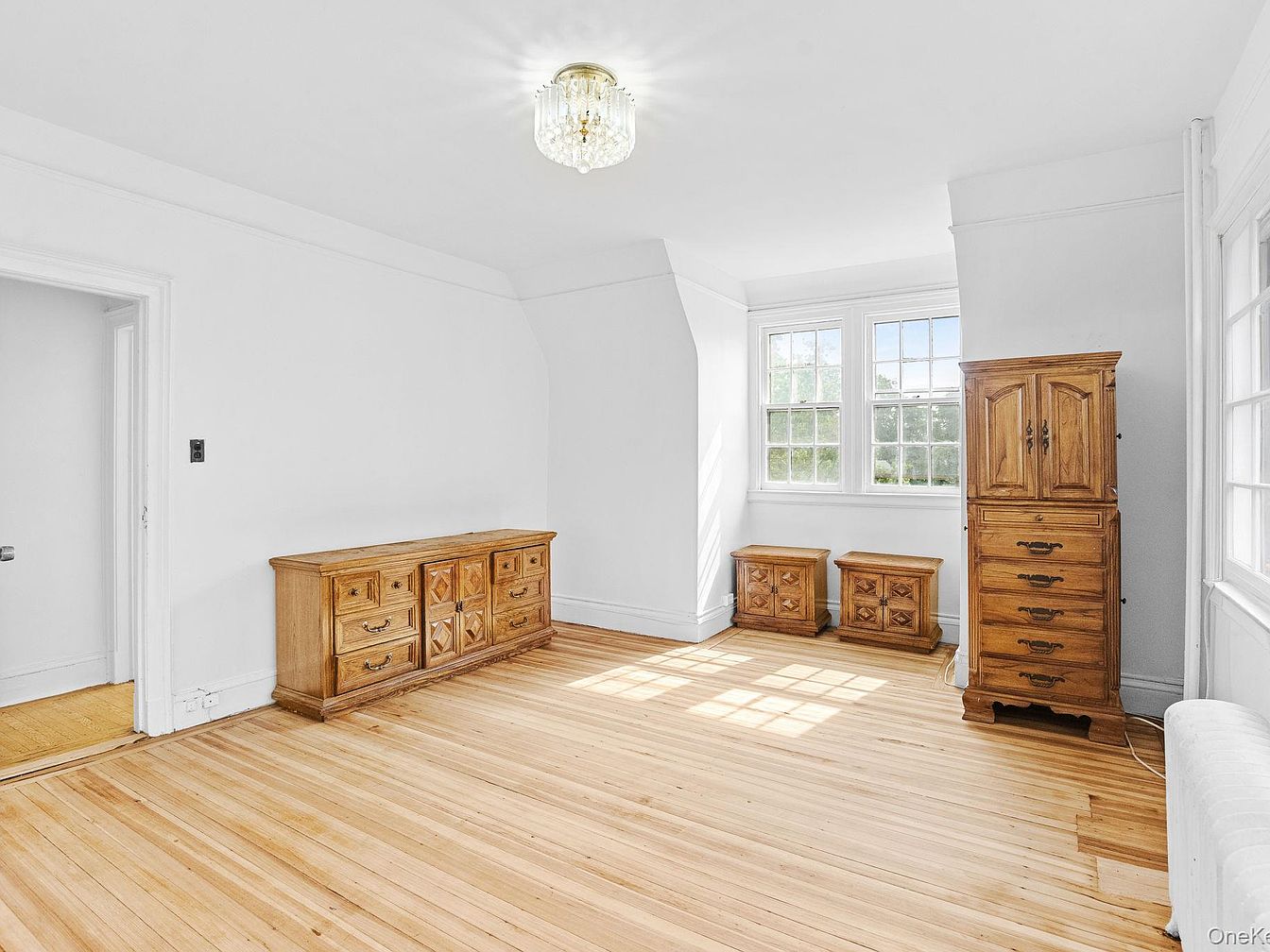 This spacious bedroom features light-colored walls that enhance its airy feel, complemented by rich, honey-toned hardwood flooring. An elegant overhead chandelier provides soft lighting, enhancing the room’s classic ambiance. The furnishings include a low wooden dresser adorned with intricate carvings, standing parallel to a tall, matching wardrobe displaying similar craftsmanship. Two small nightstands sit against the far wall, offering functional space while maintaining a cohesive look. Large windows allow natural light to flood in, casting charming shadows and highlighting the room’s crisp architectural lines. Overall, the aesthetic is timeless and invites a serene atmosphere.