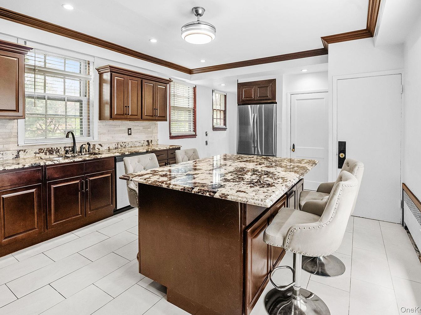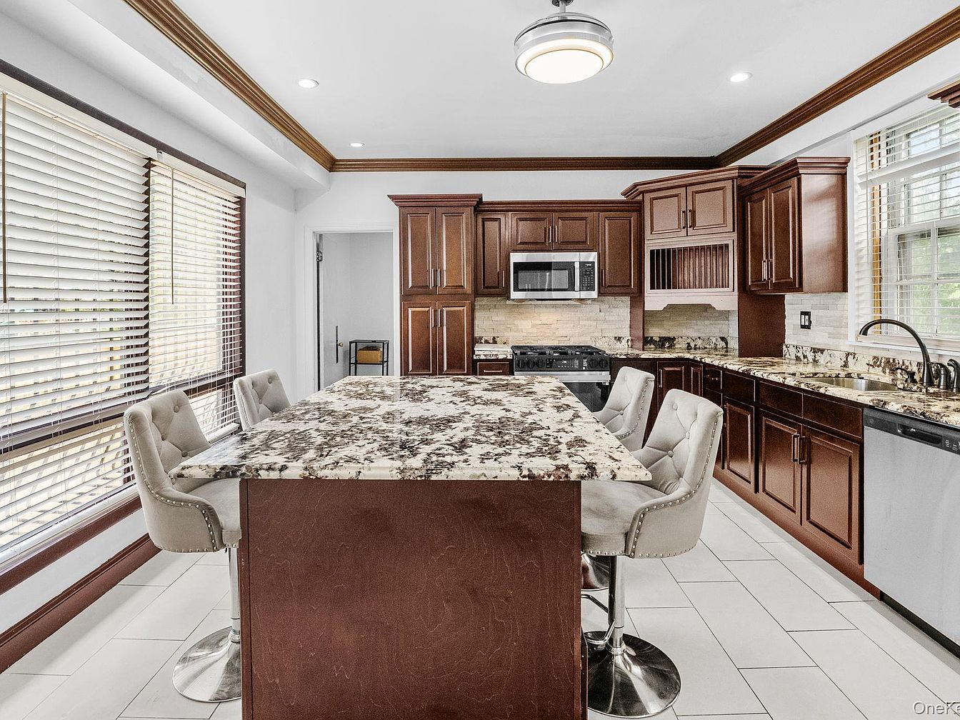 This modern kitchen features a large island with a stunning speckled granite countertop, complemented by high-back upholstered bar stools. The cabinetry is rich, dark wood, providing a warm contrast against the sleek white walls. Ample natural light pours in through the elegantly lined windows with wooden blinds. Stainless steel appliances, including a microwave and stovetop, add a contemporary touch. The backsplash consists of textured stone tiles, enhancing the room’s upscale feel. Under-cabinet lighting illuminates the workspace, creating a bright and inviting atmosphere. The polished ceramic tile floor adds a clean finish to this sophisticated culinary space.