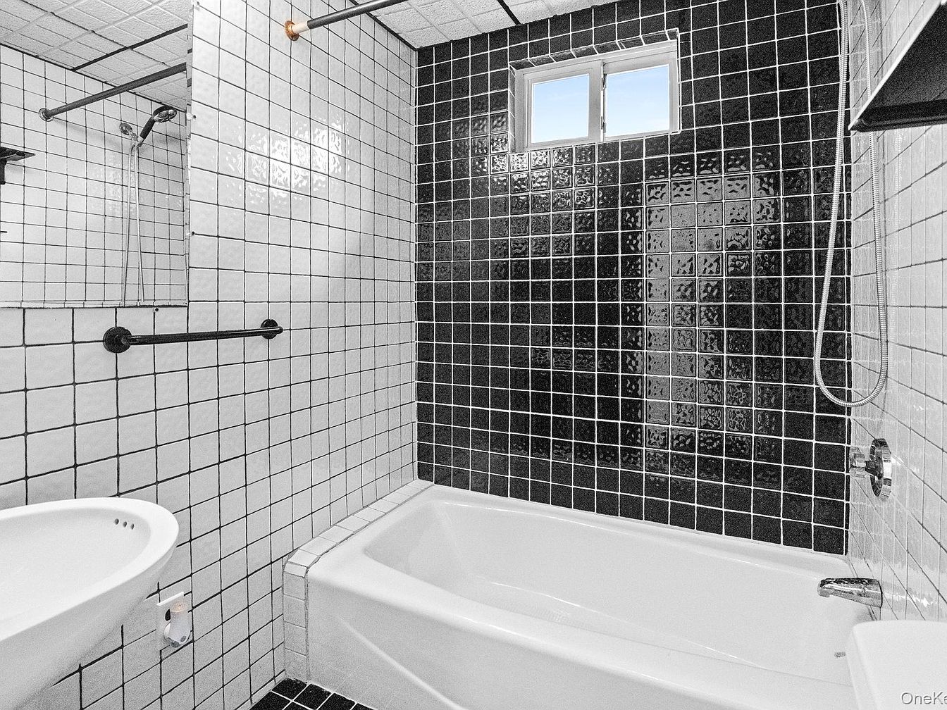 This bathroom showcases a modern aesthetic with a striking black and white color scheme. The walls are adorned with glossy square tiles that alternate between black and white, creating a bold geometric pattern. A sleek white bathtub is situated at the far end, complemented by a chrome faucet. To the left, a compact, rounded sink features a minimalist design, paired with a simple black towel rack above. A large window allows natural light to pierce through, illuminating the space while offering ventilation. The overall design combines functionality with a contemporary flair, emphasizing clean lines and an open feel.