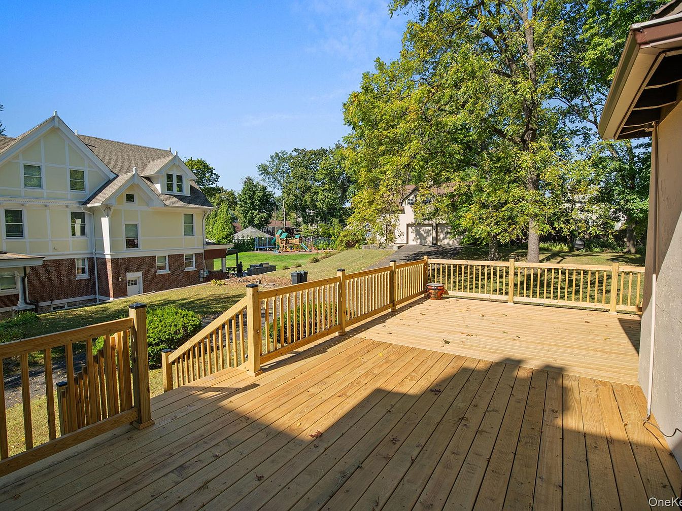 A spacious wooden deck features a warm, natural finish that complements the light-colored siding and brick of the adjacent historic home. The deck is framed by sturdy wooden railing, ensuring safety while providing a clear view of the lush backyard. Sunlight casts gentle shadows across the planks, showcasing their grain patterns. In the distance, a playground with colorful equipment contrasts with the greenery of the trees, enhancing the family-friendly atmosphere. The scene is vibrant, with blue skies overhead and ample sunlight illuminating the area, inviting relaxation and outdoor gatherings.