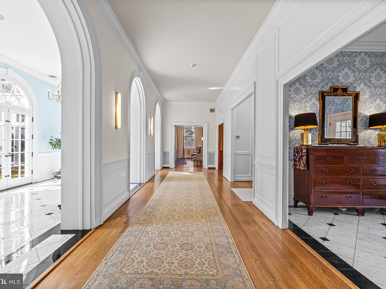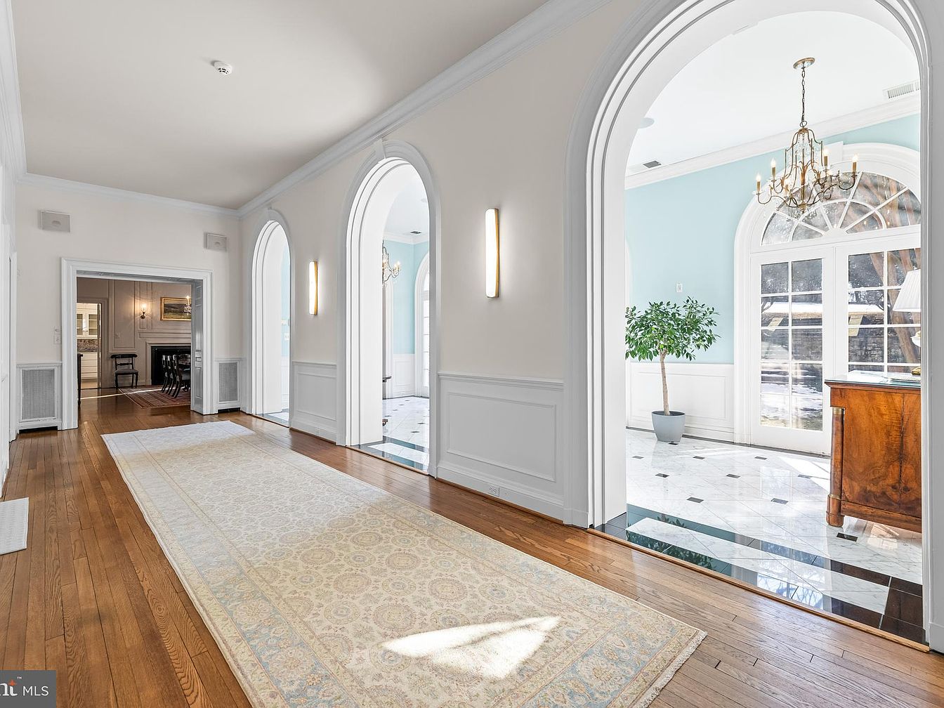 The entryway features a long, elegantly designed corridor with polished hardwood flooring and a soft, intricate area rug that complements the space. Tall, arched doorways lead to adjacent rooms, enhancing the open layout. The walls are painted in a soft, neutral color with decorative white wainscoting beneath, providing a classic touch. To one side, natural light floods in through large windows, illuminating a lovely indoor plant placed strategically in a pot. A luxurious chandelier hangs overhead, while modern wall sconces add subtle illumination, creating an inviting ambiance conducive to welcoming guests.