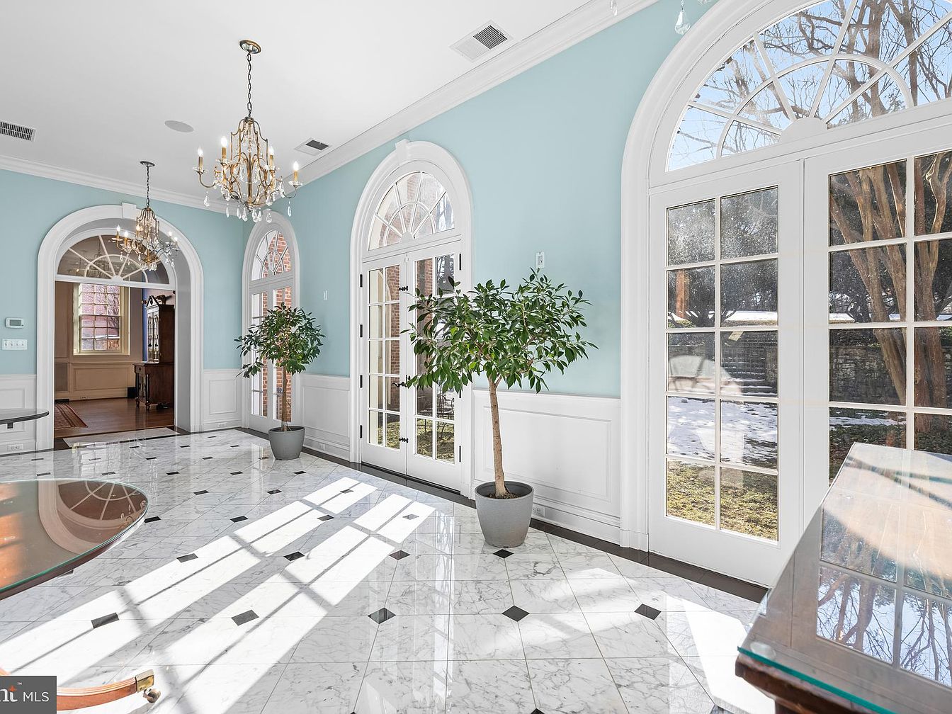 The entrance hall showcases elegant marble flooring, featuring a striking pattern with dark diamond accents set against a bright white backdrop. Light blue walls create a calm ambiance, accentuated by decorative white wainscoting. Grand arched windows allow ample natural light, enhancing the open feel of the space. Two ornate chandeliers hang from the ceiling, adding a touch of sophistication. A couple of potted plants introduce a hint of greenery, complementing the architecture. The design effortlessly merges classic elements with modern aesthetics, creating a welcoming and refined atmosphere perfect for greeting guests.