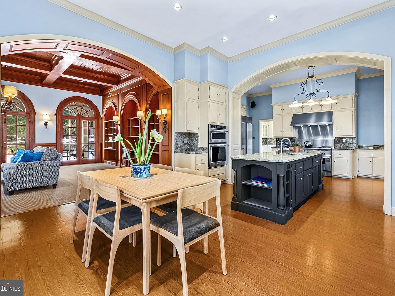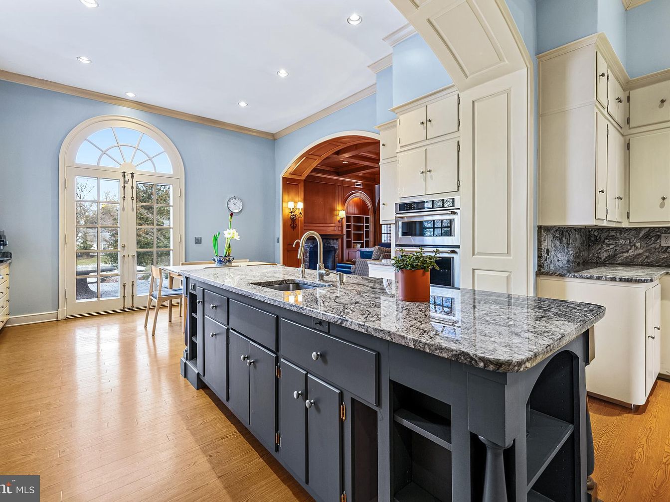 This kitchen features a spacious layout with a large central island adorned with sleek granite countertops. The island is painted in a chic navy blue, contrasting beautifully with the soft pale blue walls that surround the room. Natural light floods the space through an elegant set of French doors, framed by classic arches, leading outside. To the left, a charming wooden table with simple seating creates an inviting spot for casual dining. The cabinetry showcases a mix of white and blue finishes, harmonizing well, while stainless steel appliances and a stylish backsplash add a modern touch to the overall aesthetic.