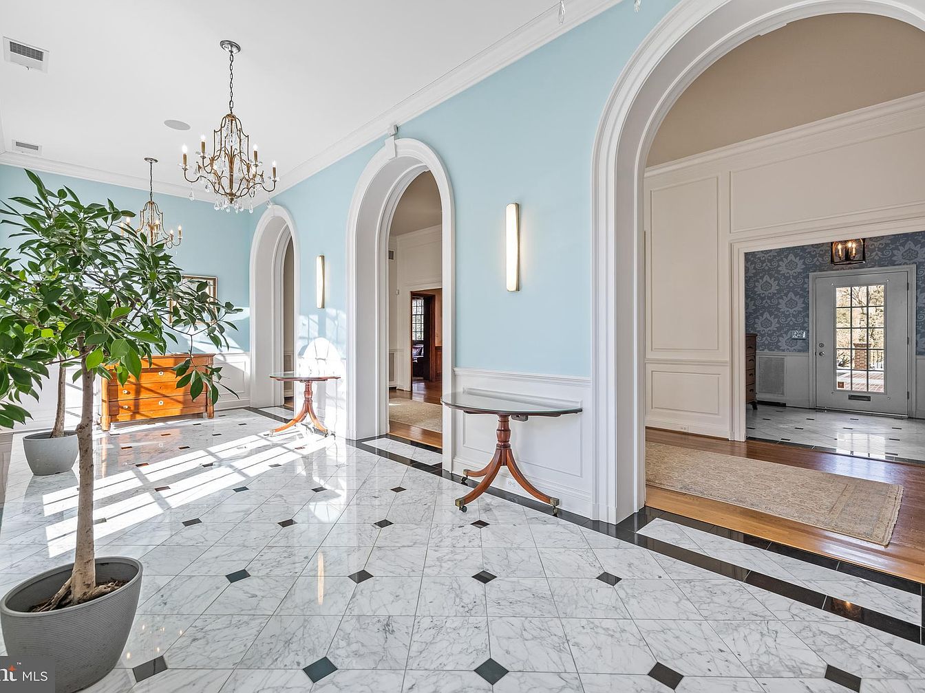 An elegant entry hall features a stunning marble floor, showcasing a checkerboard pattern with black and white tiles. Arched doorways lead into adjoining spaces, framed by detailed moldings that enhance the classic architecture. Light blue walls provide a soft backdrop, complementing the gold accents of ornate chandeliers, which illuminate the area with a warm glow. A lively potted tree adds a touch of nature and freshness. Against one wall, a polished wooden console table stands alongside a vintage chest, enriching the room’s historical charm. Natural sunlight pours through large windows, creating an inviting and airy ambiance.