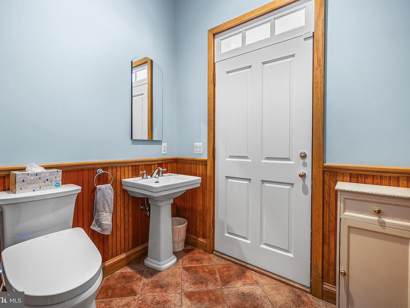 This bathroom features a light blue wall that creates a calming atmosphere, enhanced by natural light filtering in through a small window above the door. The wainscoting is made of warm wood, adding a touch of classic charm. A white pedestal sink sits elegantly beside a modern toilet, both offering a subtle contrast against the earthy tones of the terracotta tile floor. A round mirror complements the sink’s shape and reflects the room’s brightness. Accessories, such as a towel and tissue box on the sink, contribute to a well-maintained aesthetic, blending functionality with pleasing design.