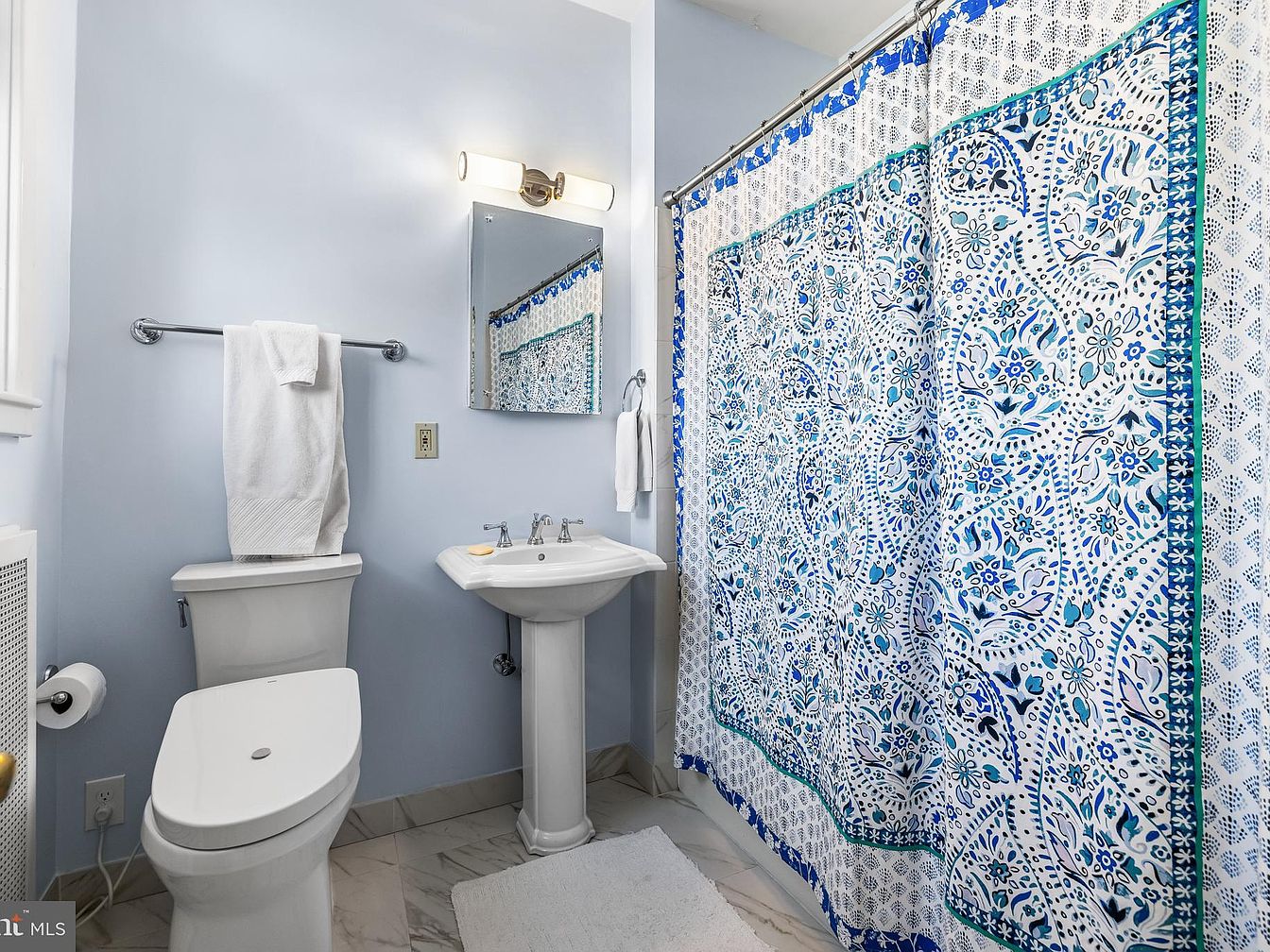 The bathroom features a soft blue color scheme, creating a calming ambiance. A sleek, modern toilet sits beside a white pedestal sink, adding elegance. The sink is complemented by shiny chrome fixtures. A large, framed mirror reflects natural light, enhancing the space. White towels hang on a towel bar next to the sink, providing a clean look. The shower area is adorned with a vibrantly patterned curtain that showcases intricate blue floral designs, bringing a vibrant touch to the room. Marble-like tiles underfoot evoke luxury, while the overall design emphasizes a fresh, contemporary aesthetic.