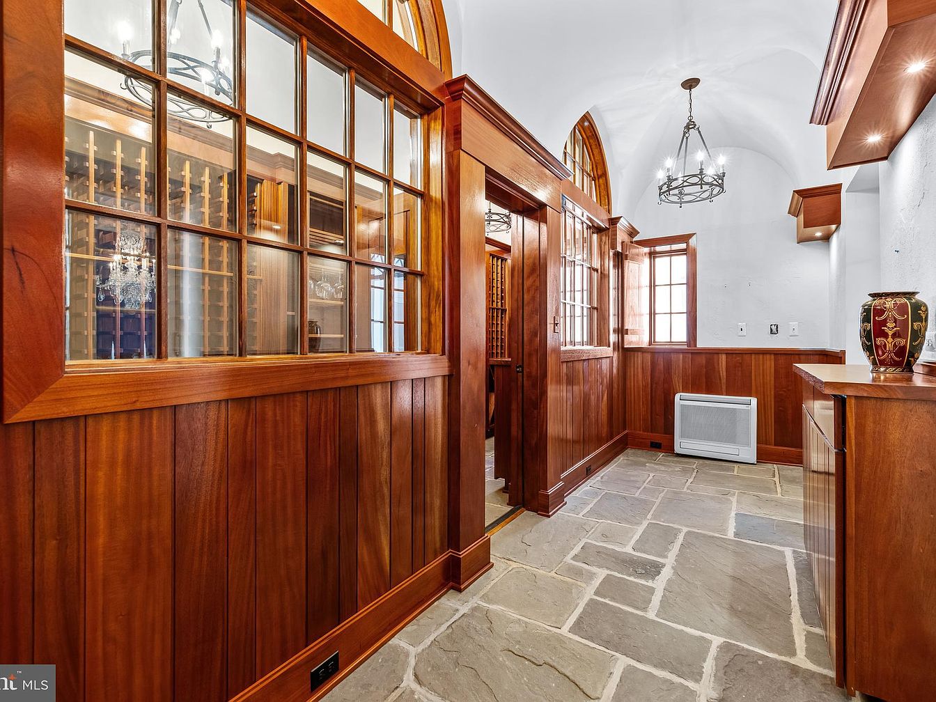 This entryway showcases rich mahogany paneling, creating a warm and inviting atmosphere. The walls feature intricate wooden details, while the flooring consists of large, irregular stone tiles, adding a rustic charm. An arched window allows natural light to filter in, emphasizing the height and elegance of the space. On the left, a doorway leads to a wine cellar, visible through glass panes, enhancing the sophisticated design. A decorative chandelier hangs from a coffered ceiling, adding a touch of elegance. Lighted shelving flanks the entry, showcasing decorative elements that complement the overall aesthetic.