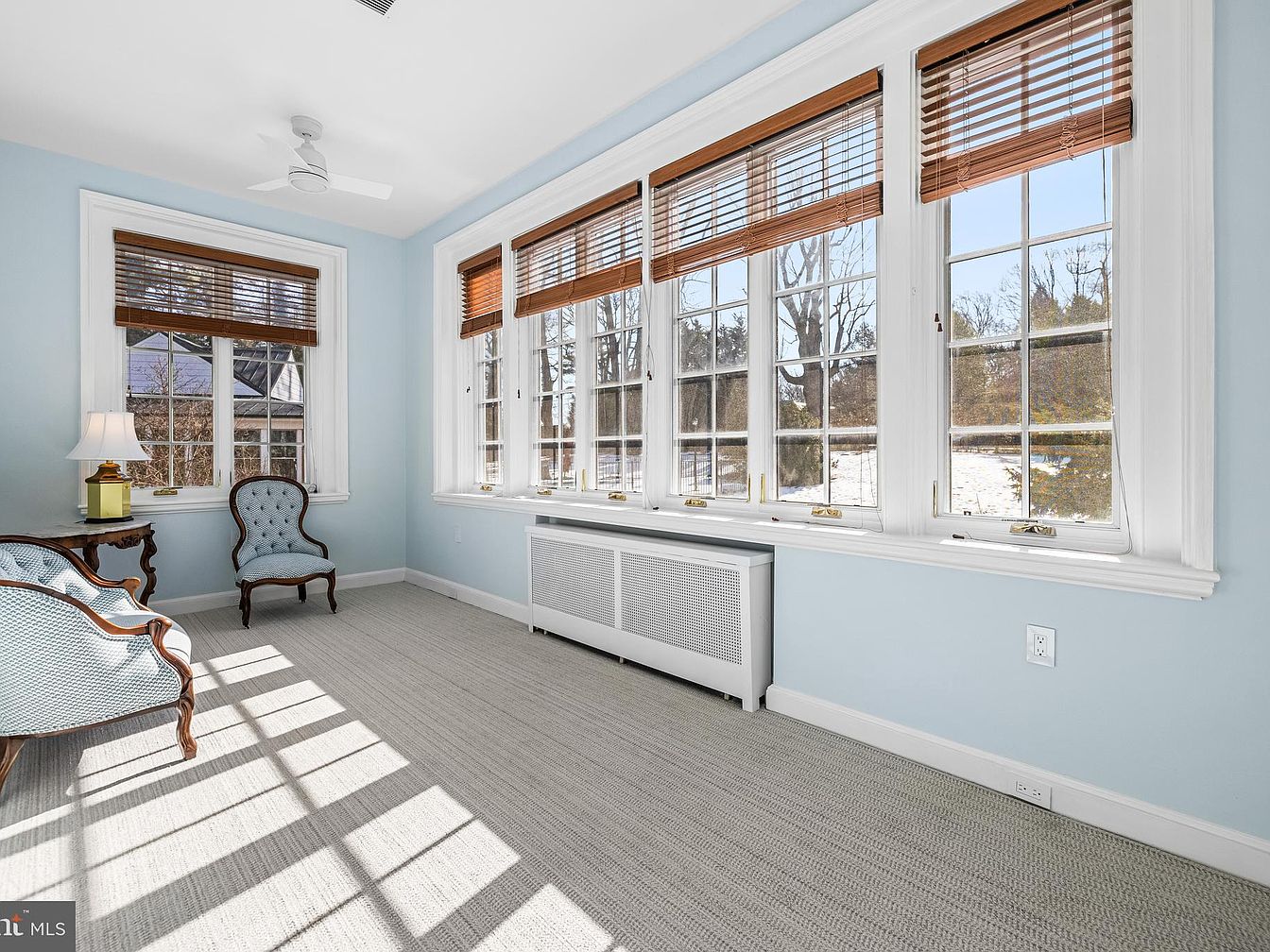 The sunroom features large windows with wooden blinds, allowing ample natural light to fill the space. Soft blue walls create a serene atmosphere, complemented by light-colored carpeting that enhances the room’s brightness. Two elegant antique chairs with a soft blue upholstery add a touch of vintage charm, positioned beside a delicate wooden table with a warm lamp, perfect for relaxing. A sleek heating unit beneath the windows maintains comfort during cooler months. The overall layout promotes openness, while the architectural details such as the white trim around the windows accentuate the historical elegance of this cozy nook.