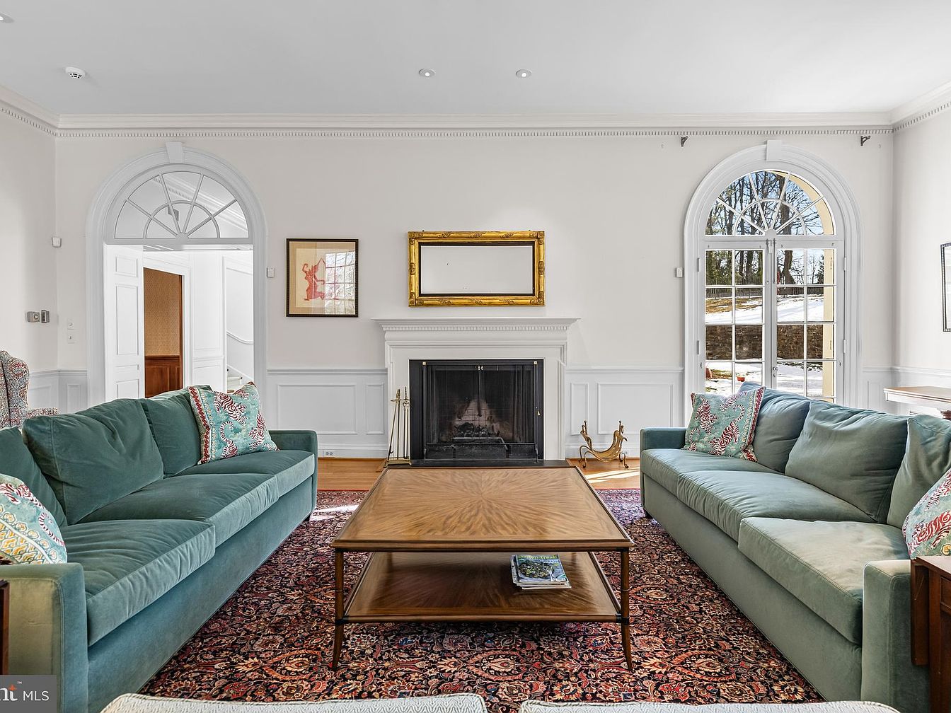 This living room features a balanced layout with two plush teal sofas adorned with decorative pillows. A rich wooden coffee table centers the area, contrasting beautifully against a patterned Persian rug that adds warmth. Elegant wainscoting lines the walls, paired with tall windows allowing natural light to flood in, enhancing the airy feel. A classic fireplace serves as a focal point, flanked by tasteful wall art, including a framed picture and a gilded mirror above. Architectural details like arched windows and crown molding contribute to the room’s charm, showcasing a harmonious blend of comfort and sophistication.