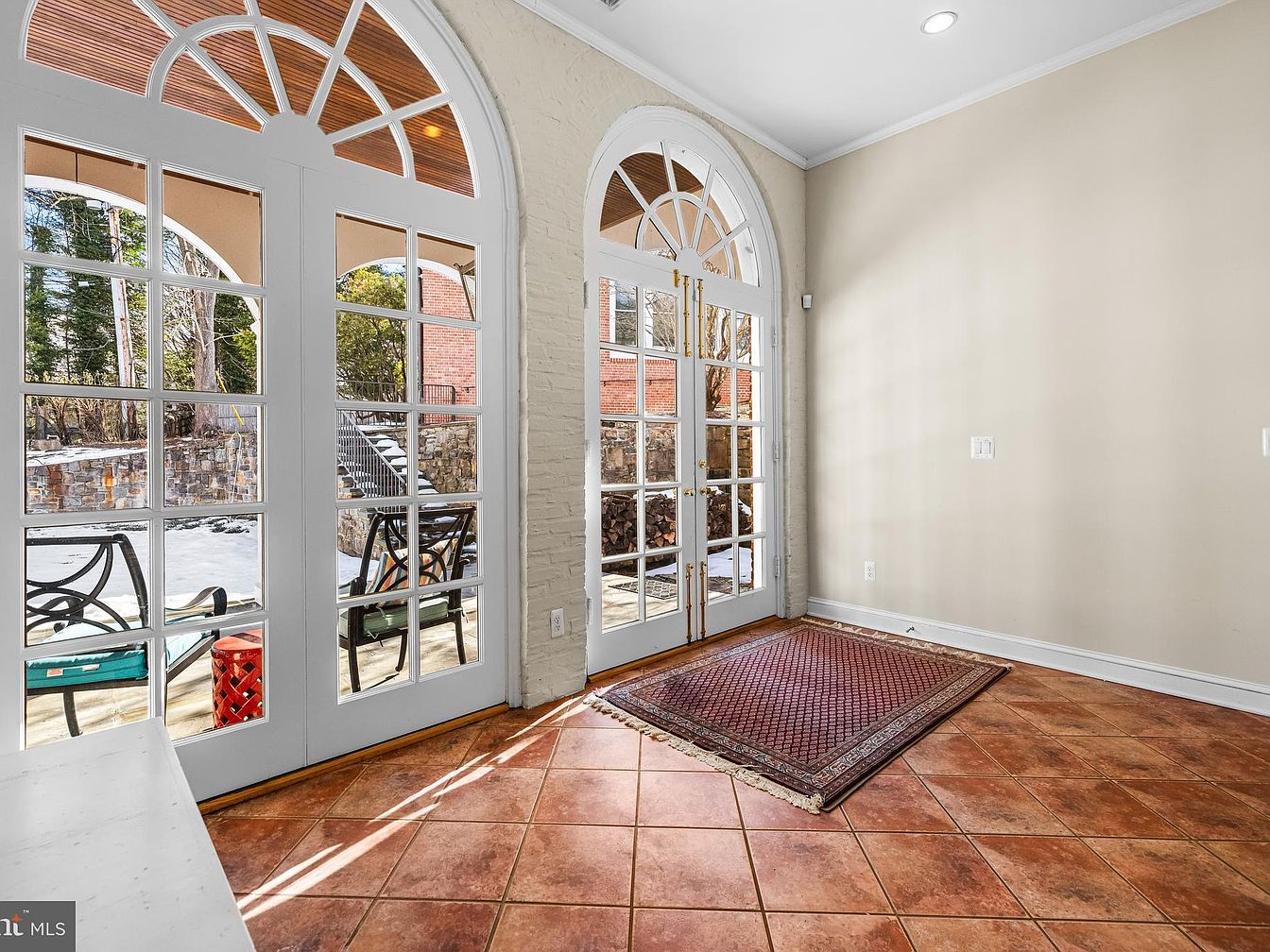 This image showcases a bright sunroom entry featuring large arched windows with divided panes, allowing ample natural light to illuminate the space. The walls are painted in a soft beige, complementing the warm tones of the terracotta tiled floor. A richly patterned area rug lies at the threshold, adding a touch of elegance. Inside, a couple of wrought iron chairs are visible through the windows, hinting at a cozy outdoor seating area. The architectural detail of the ceiling suggests a gentle curve, enhancing the openness of the space, creating a welcoming atmosphere perfect for relaxation.
