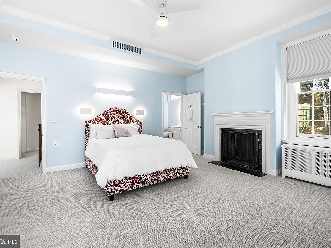 A serene bedroom featuring a soft blue color scheme that fosters tranquility. The focal point is an elaborately patterned burgundy and white bed frame, topped with crisp white bedding and accent pillows. Natural light pours in through large window sections adorned with simple blinds. To the left, there’s an elegantly designed fireplace with a white mantel, complementing the room’s color palette. Light-colored carpeting covers the floor, enhancing the cozy atmosphere. Modern wall sconces illuminate the walls while a ceiling fan adds functionality. A doorway leads to an adjoining space, hinting at a well-connected, spacious layout.
