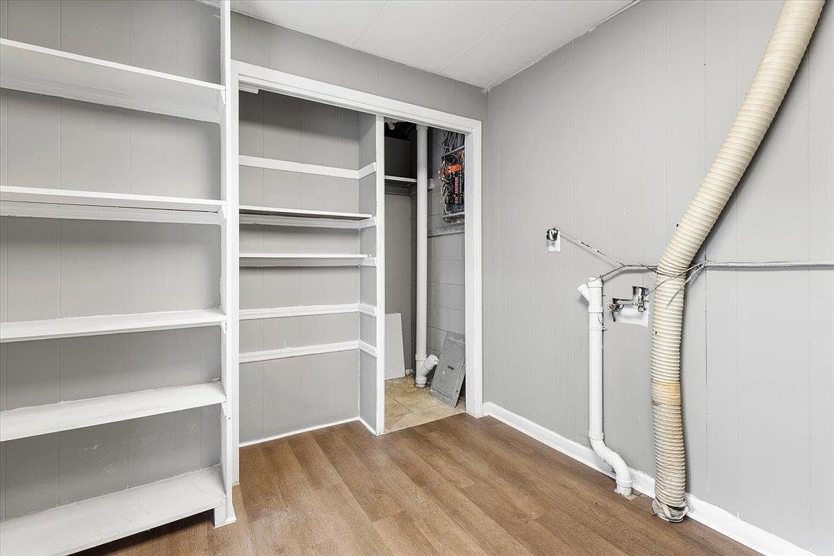 A compact utility room showcases simplistic design with light gray paneling encompassing the walls, creating an airy atmosphere. Opposite, sturdy white shelves provide ample storage, accentuating the functionality of the space. The flooring features a warm wood finish, contrasting softly against the wall color. A doorway leads to an adjoining space, while plumbing and electrical components are exposed, suggesting the room’s practical purpose. Additionally, a flexible duct extends along the wall, hinting at climate control measures. Overall, the room prioritizes utility over aesthetics, yet maintains a neat and organized visual appeal.