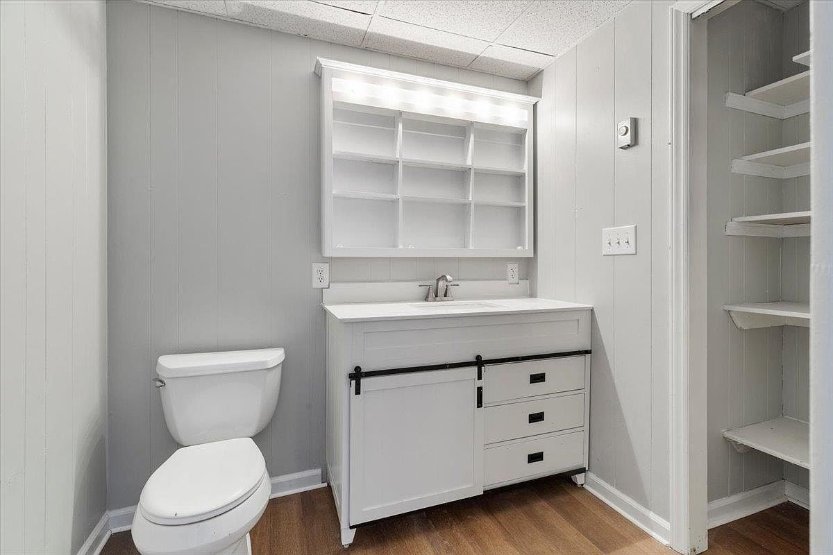 This bathroom features a minimalist design with light gray paneling on the walls, creating a fresh and airy atmosphere. A white vanity dominates the space, equipped with black hardware that adds a modern contrast. Above the sink, an open shelf showcases a neat arrangement, illuminated by recessed lighting. The hardwood floor warms the room, enhancing its contemporary feel. Adjacent to the vanity, a standard toilet is placed efficiently to maximize space. A small closet with open shelves provides practical storage for towels and toiletries, making this bathroom both stylish and functional.