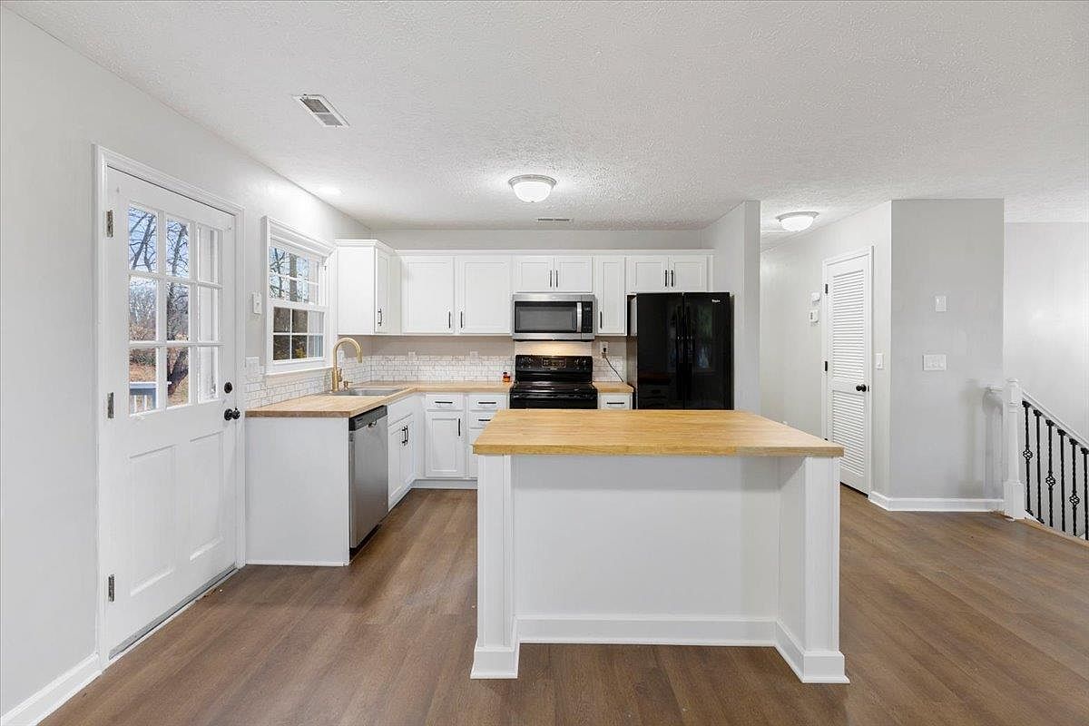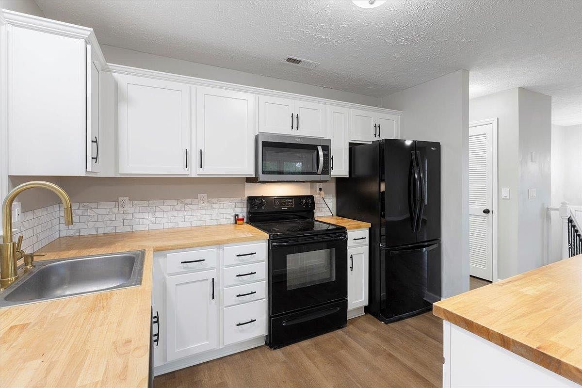 The kitchen features a modern aesthetic with sleek white cabinetry and a warm wooden countertop. A minimalist design is emphasized by black appliances including a refrigerator and stove, creating a striking contrast with the cabinetry. The backsplash is composed of white subway tiles that add texture and visual interest. A brushed gold faucet introduces a touch of elegance, aligning with contemporary trends. The open layout allows for easy movement, complemented by a textured wood floor that adds warmth. Natural light floods the space, enhancing the clean lines and subtle color palette, creating an inviting culinary environment.
