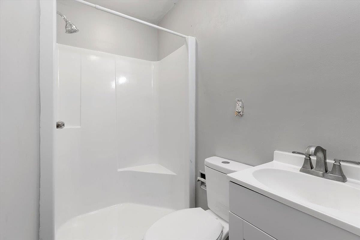 A compact bathroom featuring a clean, modern aesthetic. The walls are painted a soft gray, creating a neutral backdrop. A white, curving shower stall occupies one corner, equipped with a shiny, adjustable showerhead. Adjacent, a sleek, white vanity holds a polished sink, accompanied by brushed nickel fixtures, enhancing the contemporary feel. The toilet is seamlessly integrated, with a minimalist design that complements the overall simplicity. Bright lighting is provided overhead, ensuring the space feels open and inviting. The combination of sleek surfaces and cool tones conveys a refreshing and tidy atmosphere, perfect for everyday use.