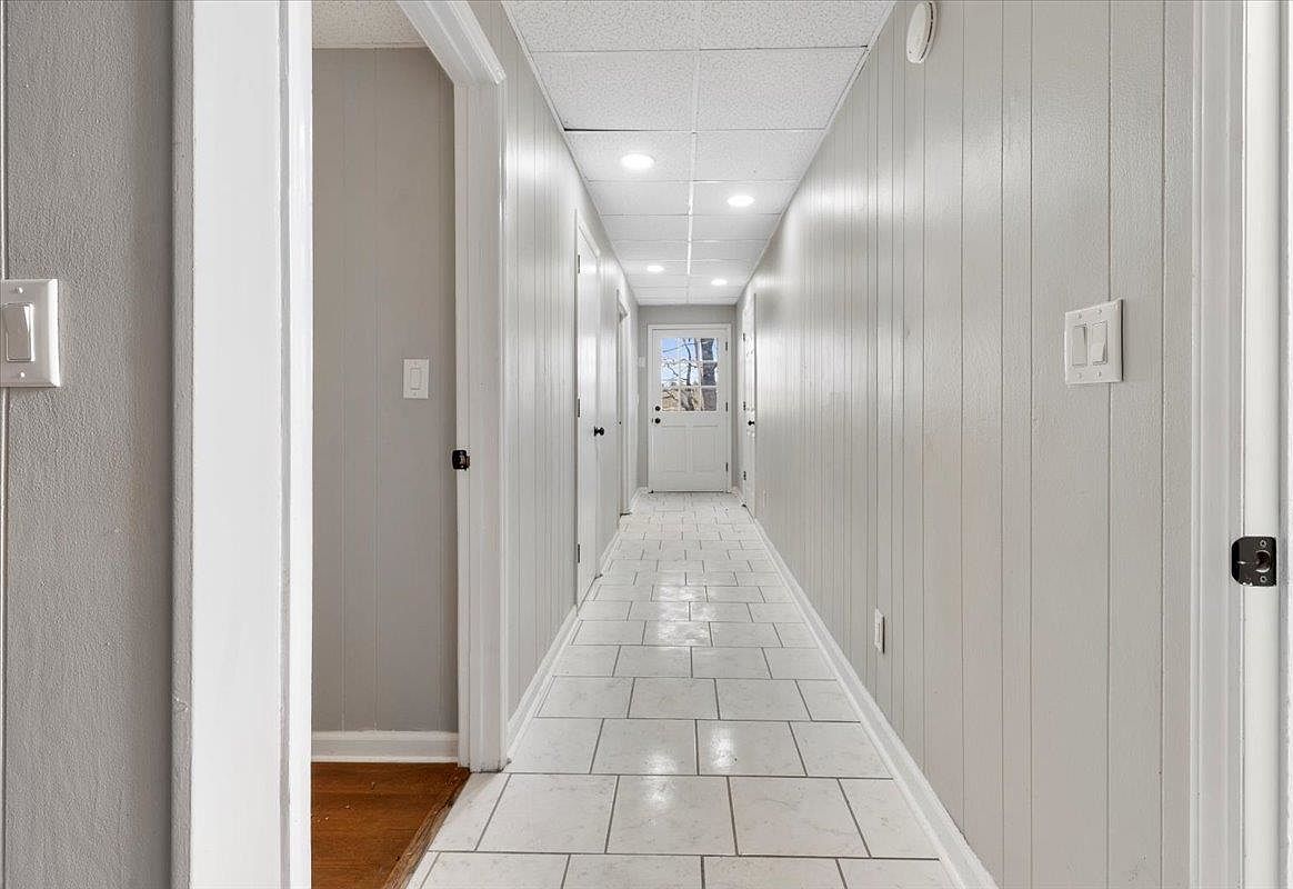 This hallway features a modern design with a neutral color palette of soft gray walls and bright white trim. The floor is lined with large, square tiles in a light marble finish, enhancing the sense of space. Recessed lighting illuminates the hallway, creating a warm and inviting atmosphere. On one side, closed doors lead to private rooms, while the far end opens to a glass-paned door introducing natural light and outdoor views. The ceiling is finished with a textured tile, adding a touch of detail to the clean, streamlined aesthetic, making the space feel open and airy.