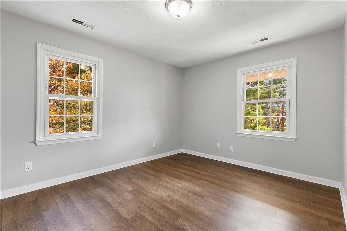 A cozy bedroom is presented with soft gray walls that create a serene backdrop. Two large windows with white trim allow natural light to flood the space, offering a glimpse of vibrant autumn foliage outside. The warm-toned wooden flooring adds warmth and complements the airy feel of the room. A simple ceiling light fixture provides adequate illumination, enhancing the minimalist aesthetic. The absence of furniture allows for an open and spacious feel, inviting personalization. The combination of neutral colors and natural elements contributes to a tranquil atmosphere, perfect for relaxation and restful nights.