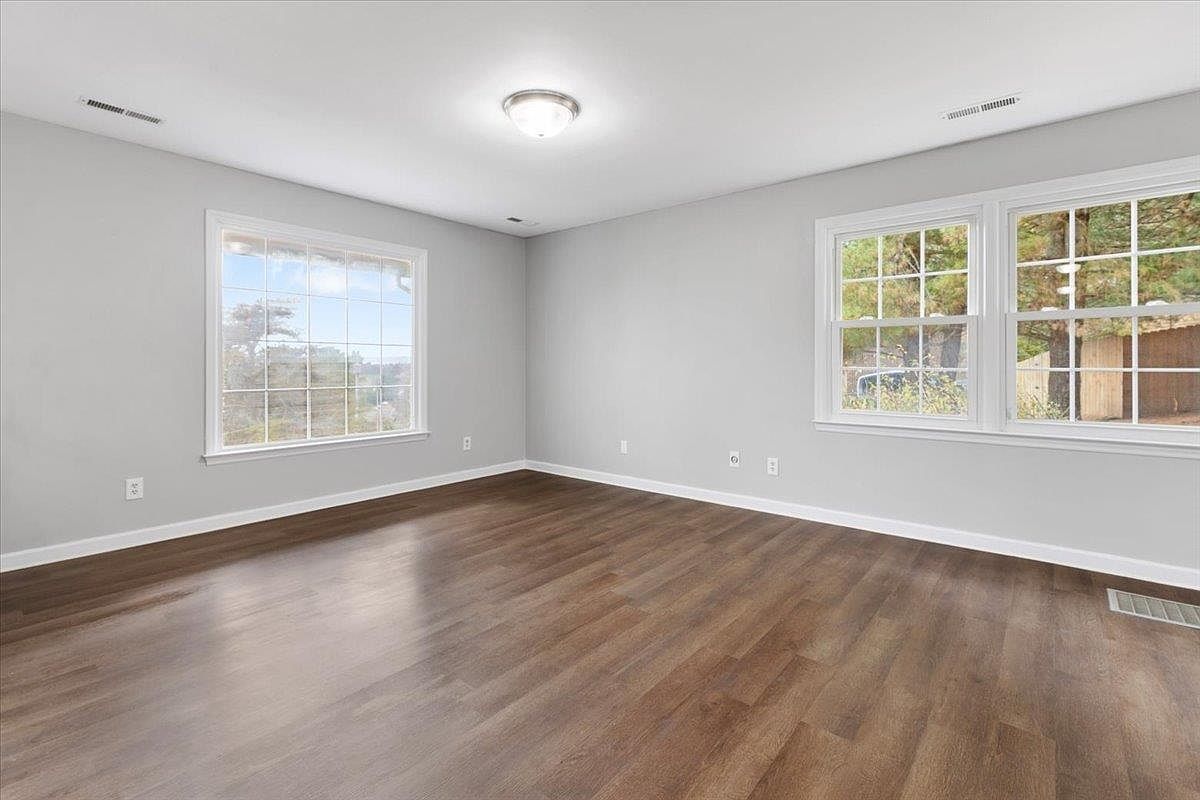 This living room features a spacious layout highlighted by ample natural light from two large windows. The walls are painted in a soft gray, creating a serene ambiance. A modern light fixture is centered on the ceiling, contributing to the room’s contemporary feel. The flooring consists of warm-toned hardwood, adding richness to the space. Clean lines are evident throughout, with baseboards neatly framing the walls. Minimal decor enhances the openness, making it a versatile area for various furnishings. Overall, the aesthetic is inviting, promoting a cozy yet modern environment, ideal for relaxation or gatherings.