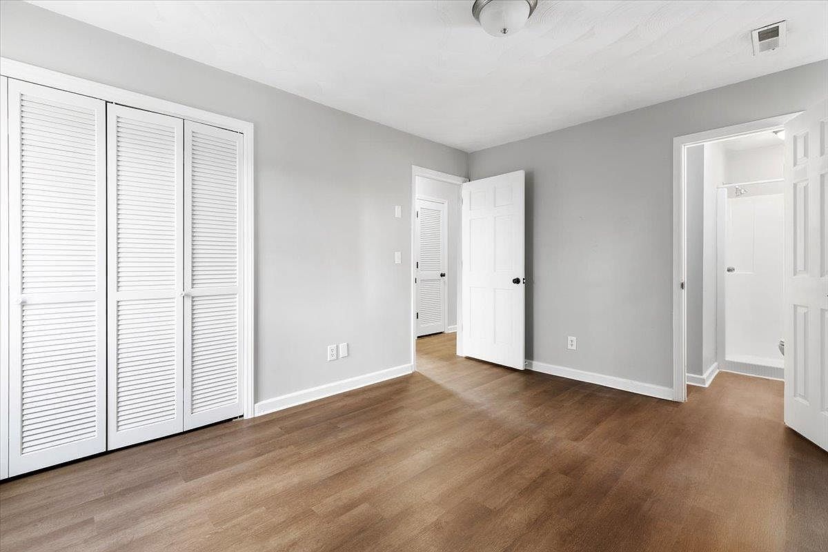 This image showcases a well-lit bedroom featuring a neutral color palette. The walls are painted in a soft gray, creating a calming atmosphere, complemented by a smooth, light wood laminate floor. Folding louvered closet doors in white add a touch of classic design while providing ample storage. A bright ceiling light fixture enhances the airy feel, reflecting the room’s natural light. The layout includes a partially open door leading to an adjacent bathroom, emphasizing convenience. Overall, the minimalistic approach and subtle color scheme contribute to a serene and spacious environment.