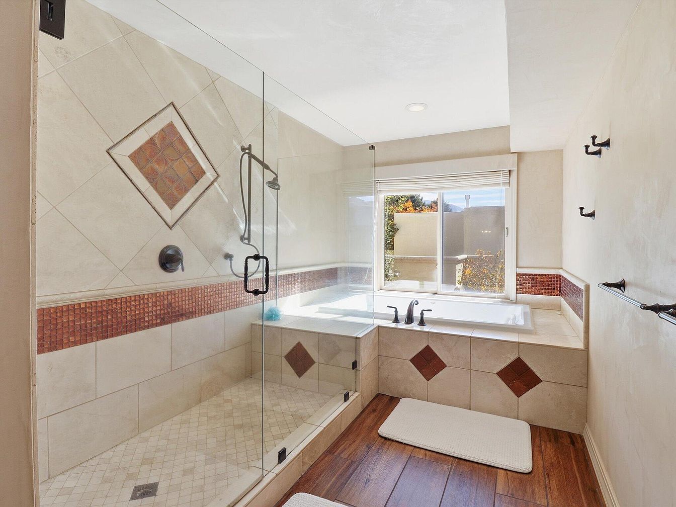 This bathroom melds modern comfort with contemporary elegance. A sleek glass shower enclosure showcases intricate tile work, featuring a diamond-shaped accent that adds visual interest. The soothing color palette includes soft beige tiles alongside rich reddish-brown accents, creating warmth. Natural light floods the space through a sizable window, enhancing the airy feel. A luxurious jetted tub sits adjacent, perfect for relaxation. Throughout, dark fixtures contrast beautifully with the lighter tones, providing a stylish finish. Textured wood-look flooring adds warmth underfoot, while plush mats enhance comfort and accessibility, making this space both functional and inviting.