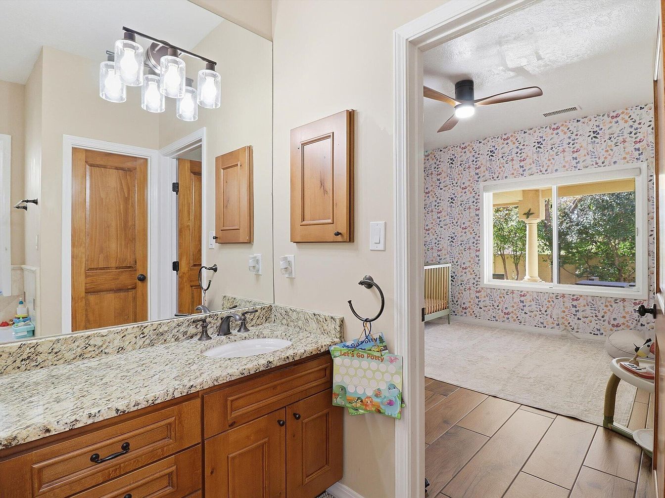 The bathroom features a spacious vanity with a stunning granite countertop, showcasing earthy tones that complement the warm wooden cabinetry. A sleek faucet sits snugly against the countertop, reflecting light from the modern glass fixture above. Light beige walls create a cozy atmosphere, enhanced by the natural light streaming through the adjacent room’s large window adorned with playful floral wallpaper. A stylish ceiling fan adds charm, while wooden doors contrast elegantly against the wall colors. Notice the thoughtful storage solutions with wooden panels, and a subtle glimpse of a nursery area beyond, enhancing the space’s functionality.