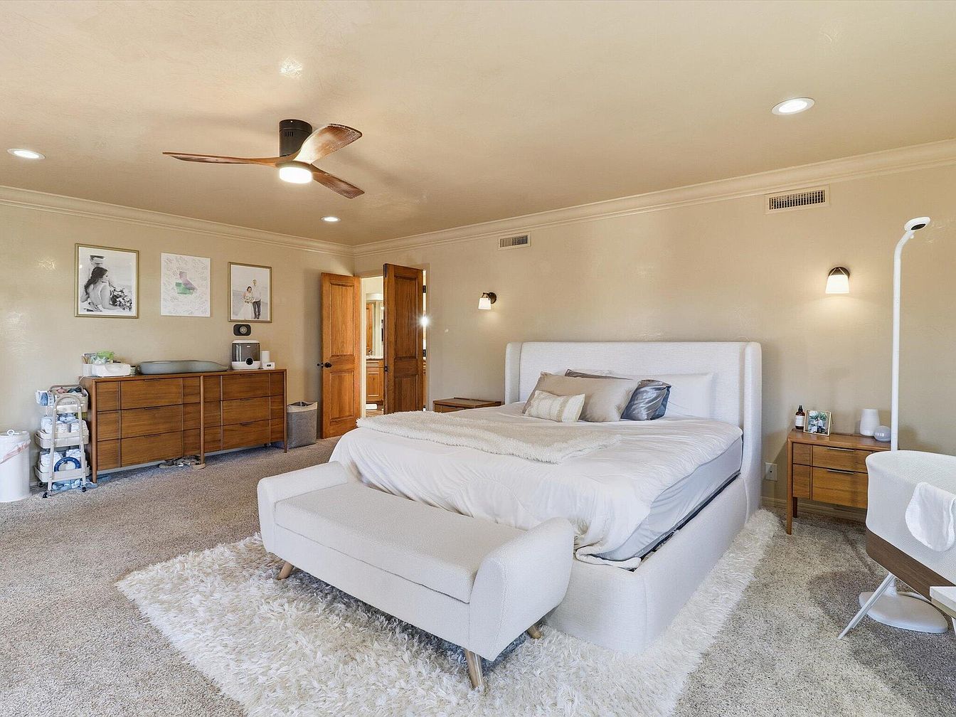 A spacious bedroom featuring a contemporary design with soft beige walls and plush carpet, providing a cozy atmosphere. Central to the room is a large, inviting bed adorned with luxurious white bedding and decorative pillows. A modern fan hangs from the ceiling, enhancing comfort. Surrounding the bed are wooden nightstands, one displaying a framed photo and a nightlight. A sleek, light-colored sofa at the foot of the bed complements the décor. Artwork adorns the walls, adding a touch of personality. Warm lighting from sconces and natural light creates a serene ambiance, highlighting the room’s stylish simplicity.