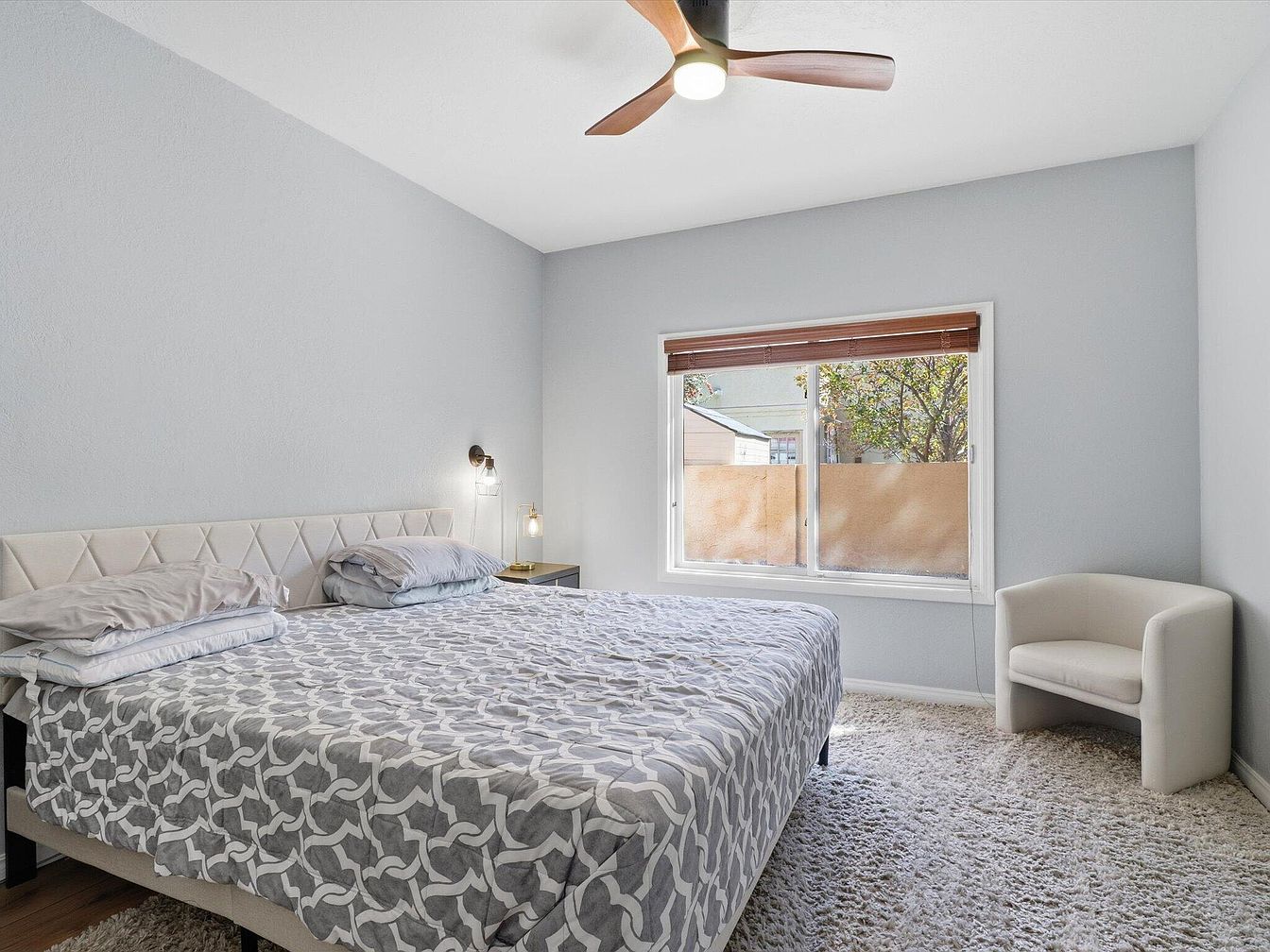 The bedroom features a large, plush bed adorned with a geometric-patterned gray and white duvet, complemented by light gray pillows. A modern, tufted headboard adds elegance, while a sleek nightstand holds a stylish lamp that provides soft lighting. The walls are painted in a subtle light gray, enhancing the room’s tranquility. A contemporary ceiling fan circulates air, creating a comfortable atmosphere. A large window, dressed with wooden blinds, invites natural light and offers a view of the outdoors. The floor is covered with a cozy, fluffy area rug, adding warmth to the space. A minimalist white chair completes the room’s inviting aesthetic.