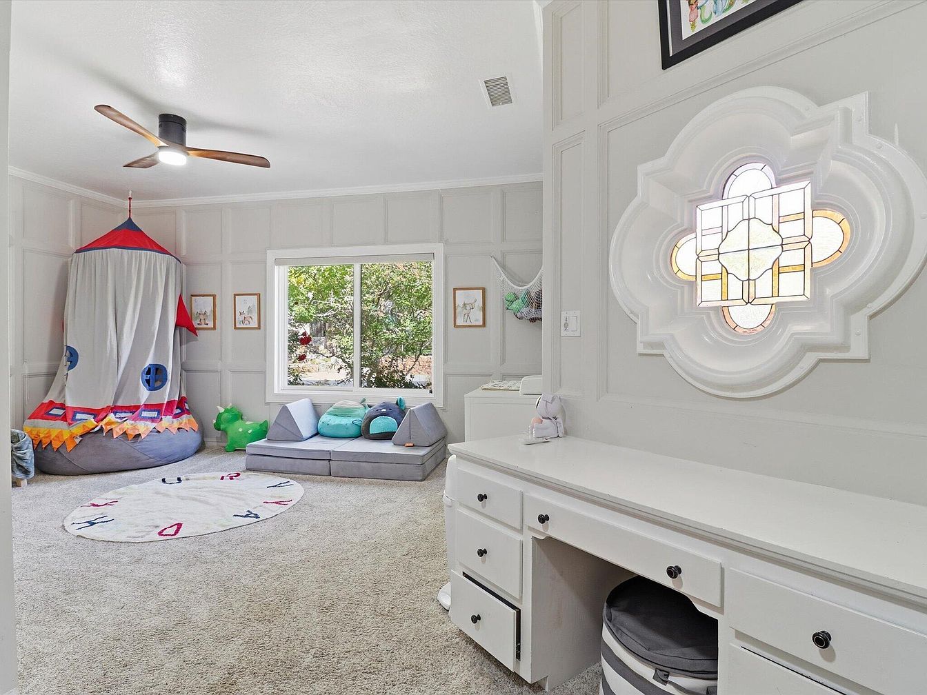 This vibrant kid’s playroom features a light gray paneled wall and a cozy carpet that invites play. A whimsical rocket tent in bright colors adds an imaginative focal point. Soft seating is arranged with foam blocks in varied shades, promoting comfort and creativity. Natural light streams through a large window, surrounded by two charming framed artworks. A unique stained-glass window adds a touch of elegance to the space, harmonizing with playful aesthetics. A white dresser with multiple drawers offers practical storage, enhancing the room’s functionality while maintaining a cheerful, airy atmosphere ideal for play and relaxation.