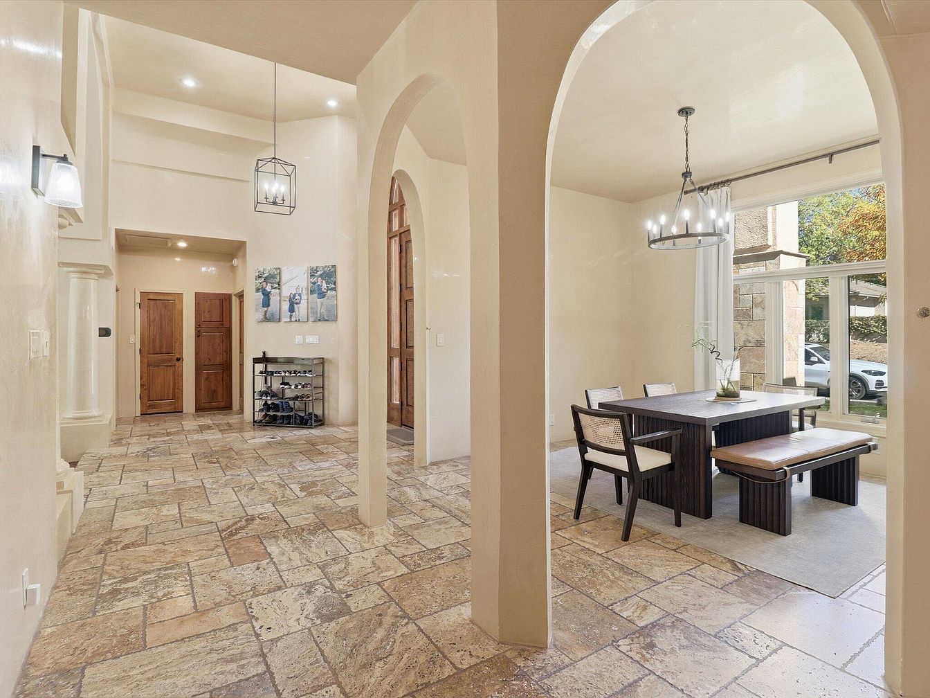 The entryway features an elegant arched wood front door with detailed carvings, welcoming guests into the home. A spacious layout showcases natural stone flooring, adding warmth and texture. To the left, a stylish shoe rack holds various footwear, emphasizing functionality. On the right, large windows allow ample natural light, brightening the open space leading to a dining area. Three framed photos hang on the wall, adding a personal touch. Light-colored walls complement the earthy tones of the flooring, while a modern pendant light fixture enhances the entry’s sophistication. Architectural details include rounded arches, creating a seamless transition.