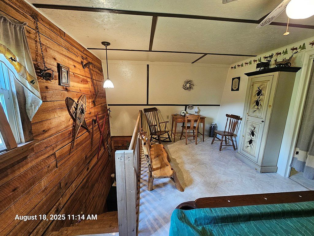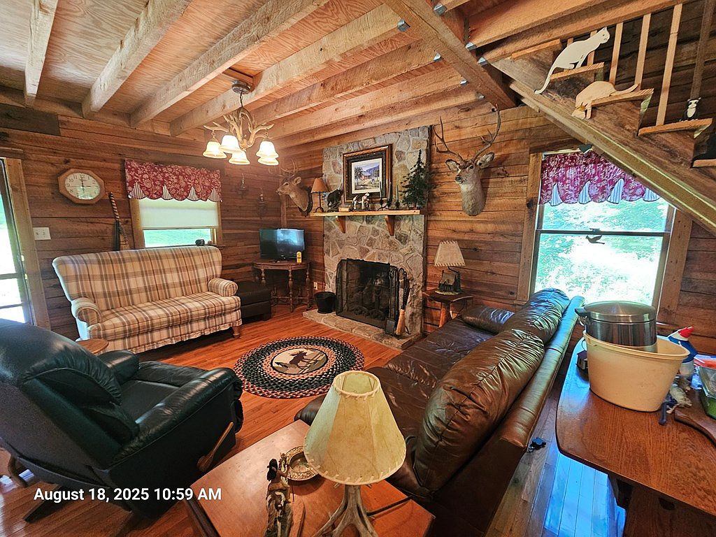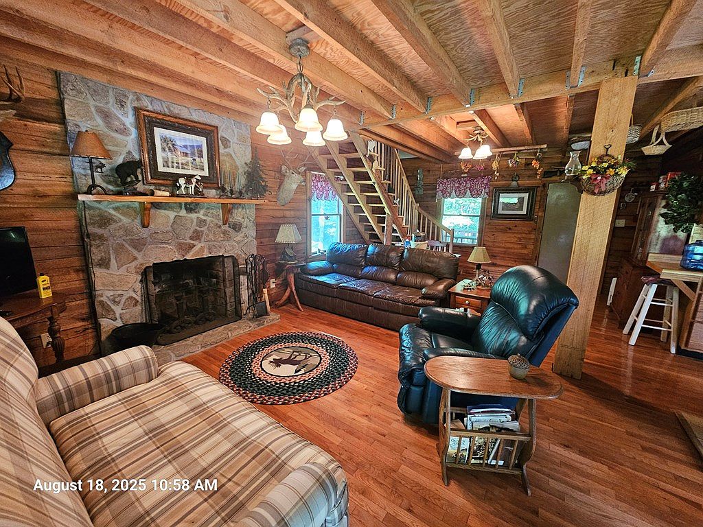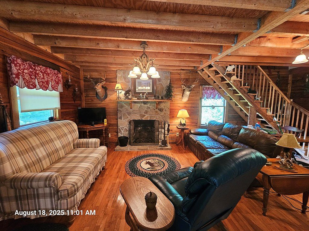 This cozy living room features rustic wooden beams accentuating the ceiling, complemented by warm-toned wooden walls. A stone fireplace serves as the room’s focal point, adorned with framed artwork and a lamp. The seating area includes a plaid sofa and a brown leather couch, both inviting relaxation. A circular area rug with a wildlife motif adds a touch of charm to the hardwood floor. Natural light streams through the large windows, draped with floral curtains. A wooden coffee table shows care with books and a decorative piece, while a staircase leads to an upper level, enhancing the home’s spaciousness.