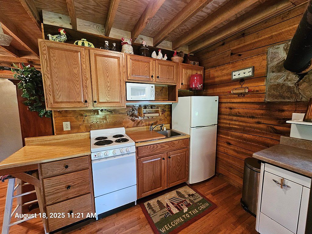 The kitchen features rustic wooden cabinetry with a warm oak finish, harmonizing with the log walls that exude a cozy, cabin-like charm. A compact layout includes a white stovetop and microwave integrated with the cabinetry, ensuring efficient use of space. The refrigerator stands adjacent, finished in a clean white that contrasts the natural wood. A wooden countertop provides a practical surface, complemented by a colorful area rug that invites warmth. Decorative elements, such as whimsical bird figurines and greenery, adorn the shelves, enhancing the inviting atmosphere while maintaining a rustic aesthetic overall.