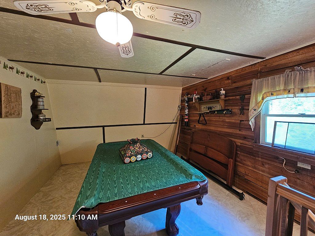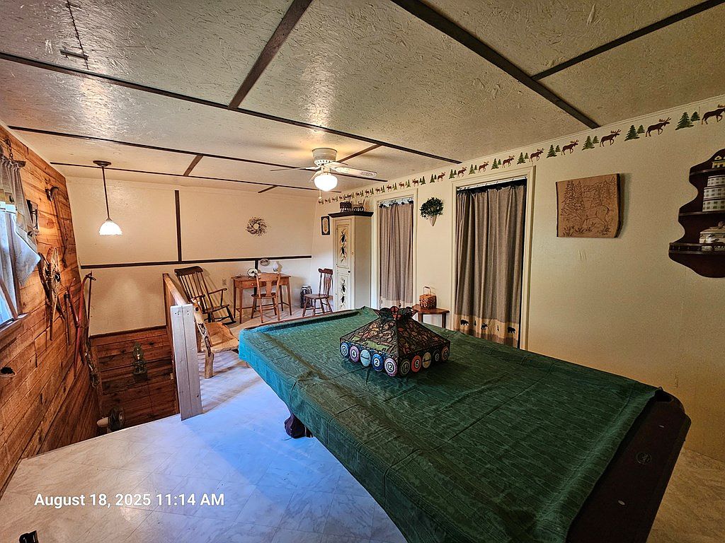This cozy game room features rustic wood paneling along one wall, enhancing its warm, inviting ambiance. A green felt pool table dominates the center, paired with a decorative lamp above it. Surrounding the space are wooden chairs and a small table, offering a spot for casual gatherings. Soft beige walls highlight decorative accents, including a nature-themed border and wall-mounted decor pieces. Large windows draped with soft gray curtains allow natural light to filter in, while ambient lighting from overhead fixtures creates a playful atmosphere. The flooring, finished in light tile, complements the earthy tones of the decor.