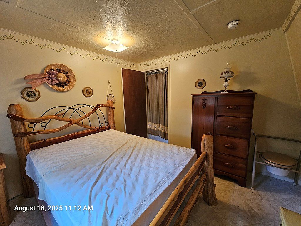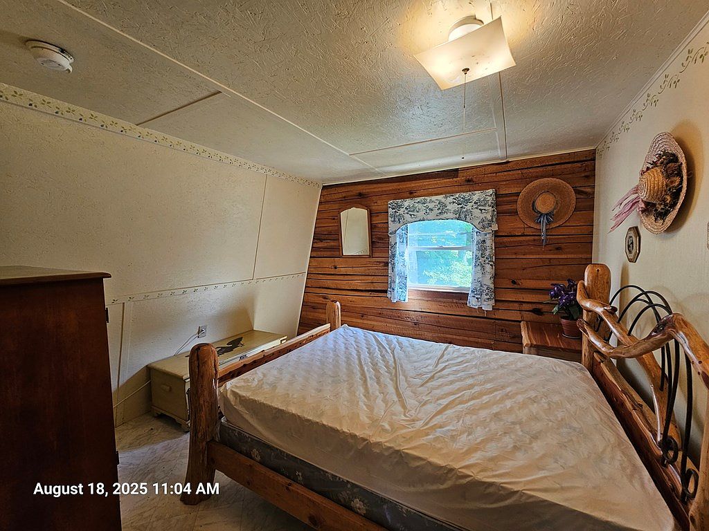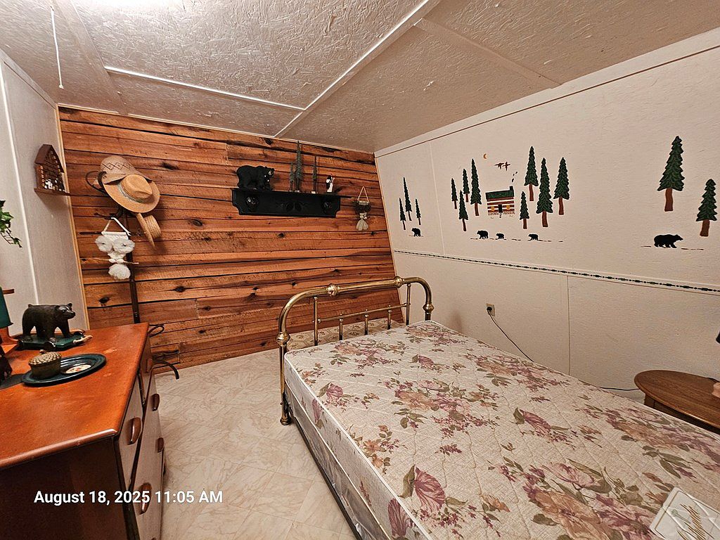 The bedroom features a cozy ambiance with a wooden accent wall showcasing rich tones that enhance warmth. The bed, dressed in a floral-patterned comforter, complements the rustic aesthetic. To one side, a vintage dresser adds character, its rounded drawer handles providing an inviting touch. Decorative elements include small figurines, a cowboy hat, and scenic wall art featuring trees and bears, evoking a nature theme. The flooring is light-colored, contrasting with the darker wood wall, and offers a polished look. Soft lighting from above further accentuates the room, creating a peaceful retreat for relaxation.