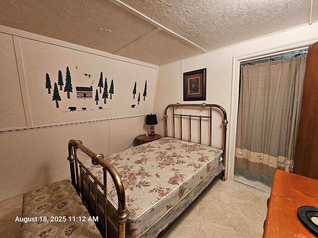 A cozy bedroom features a vintage brass bed with floral bedding, creating a quaint atmosphere. To the side, a small wooden nightstand holds a classic lamp, providing a warm glow. The wall showcases a rustic mural depicting evergreen trees and bears, enhancing the room’s natural theme. Opposite, a framed artwork adds a touch of character. A curtain with animal motifs hangs by the window, adding a playful element. The flooring is a light, patterned tile, complementing the pale wall color. Overall, the room radiates a charming warmth, blending rustic elements with simple, comfortable furnishings.