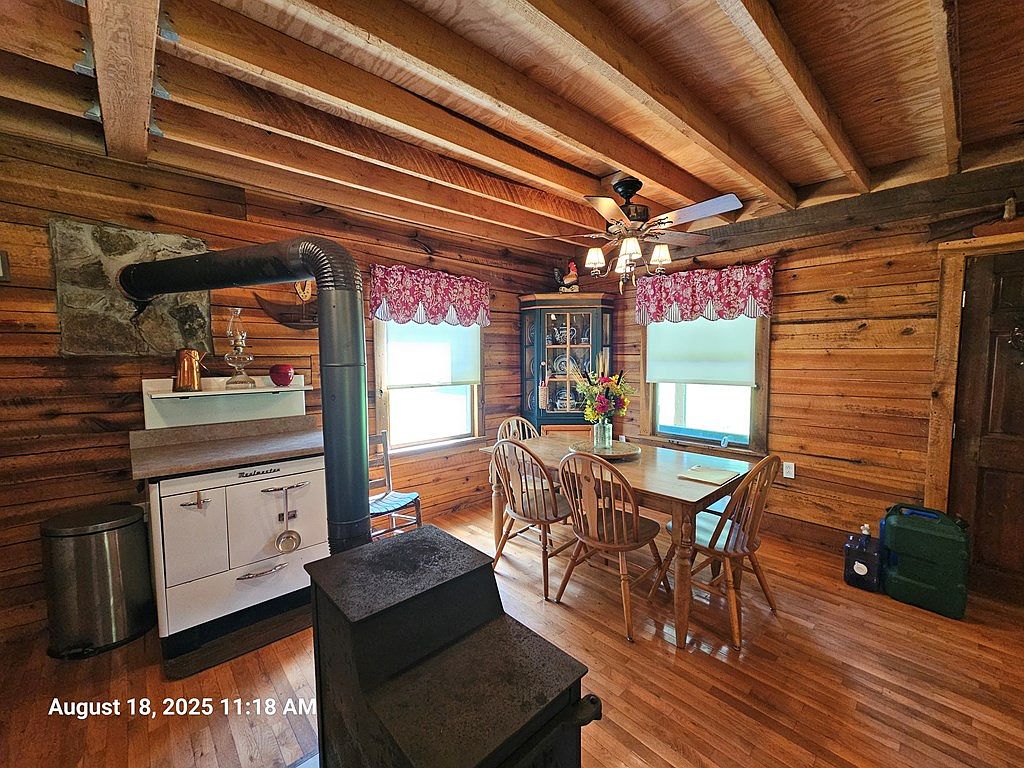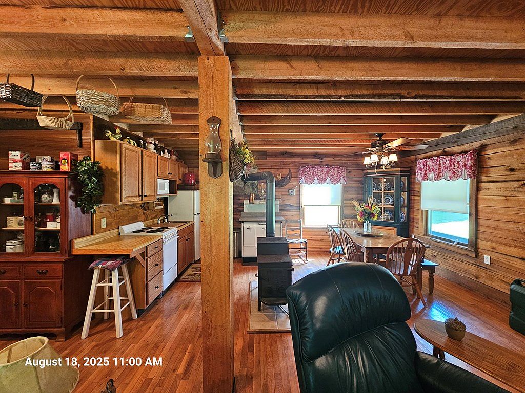 The kitchen showcases rustic charm with exposed wooden beams and richly stained wooden walls. A traditional white stove stands prominently, complemented by a well-maintained metal counter. The dining area features a rectangular table surrounded by wooden chairs, inviting convivial gatherings. Bright natural light filters through two windows adorned with lacy red valances, enhancing the room’s warmth. A colorful flower arrangement on the table adds a vibrant touch, harmonizing with the earthy tones of the wood. The room blends functionality with a cozy atmosphere, highlighted by subtle decorative items and a sleek trash can, reflecting a well-kept home.