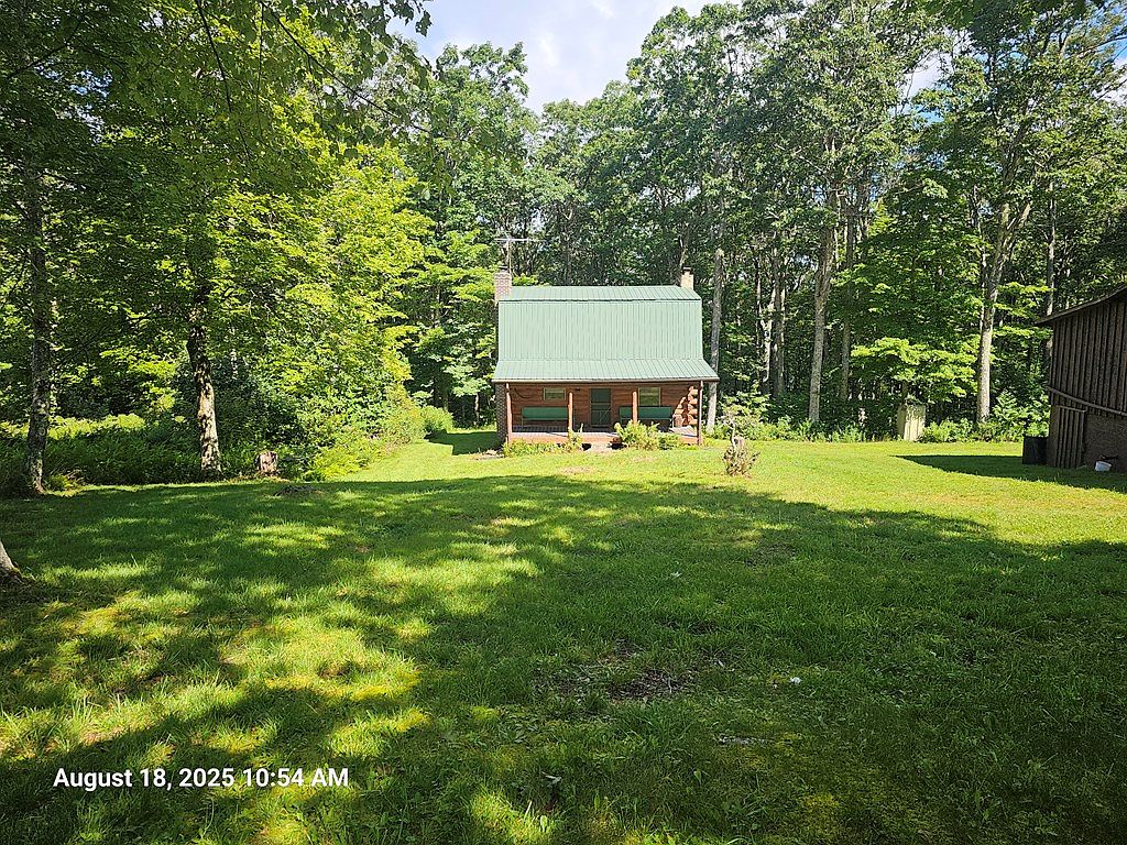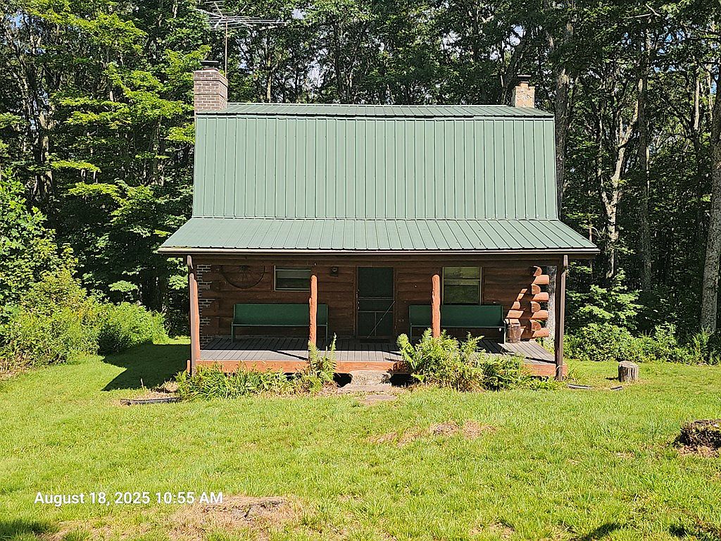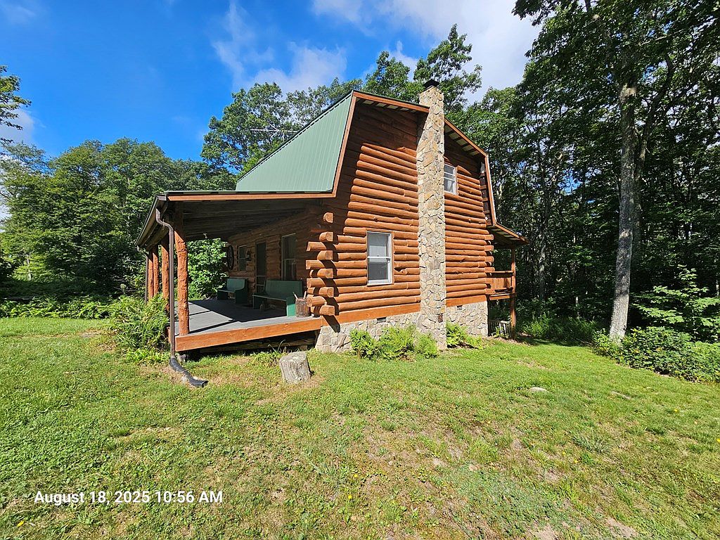 The side view of a charming log cabin reveals its rustic charm and natural surroundings. The structure features traditional wooden logs with rich brown hues, complemented by a vibrant green metal roof. A sturdy stone chimney adds texture and visual interest. The expansive porch, partially shaded, offers seating, creating an inviting spot to enjoy the outdoors. Surrounding the cabin, lush greenery and mature trees establish a serene atmosphere, enhancing the connection to nature. The smooth, grassy area in the foreground adds to the tranquil setting, perfect for leisurely outdoor activities.