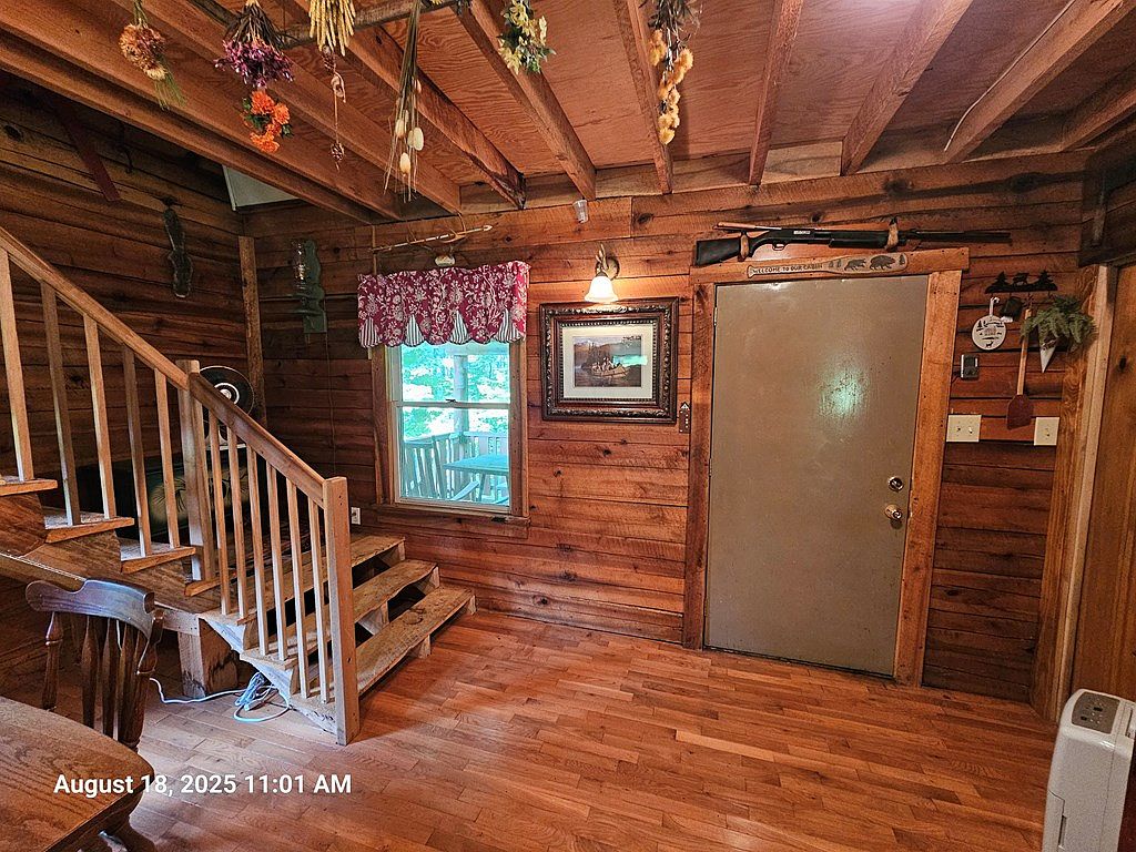 This entryway features warm wooden textures and a rustic charm, with exposed beams and paneled walls, emphasizing a cozy atmosphere. The floor showcases polished wooden planks that enhance the inviting aesthetic. A wooden staircase leads to an upper level, flanked by a simple railing. Natural light filters through a window adorned with a patterned red and white valance, offering a glimpse of the outside. Artwork hangs near the entrance, complemented by a vintage door adorned with a decorative frame. Hooks and a small shelf display rustic items, contributing to the overall homey, country feel.