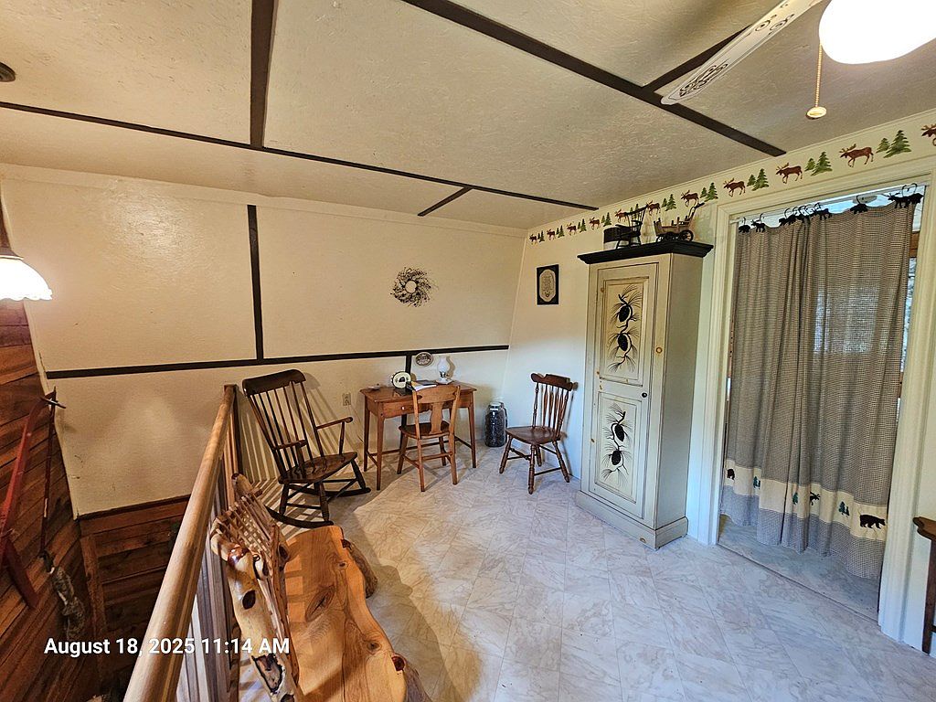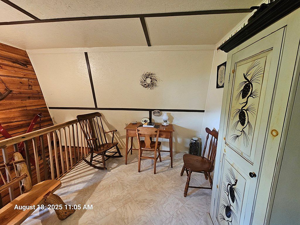 This cozy nook features a rustic aesthetic, highlighted by a wooden railing and a mix of warm tones from the natural flooring. The walls are painted in soft white with dark wooden accents, creating a charming contrast. A small round table sits near the wall, accompanied by two vintage wooden chairs. Decorative elements include a nature-themed wallpaper border depicting trees and wildlife, enhancing the room’s outdoor connection. An antique cabinet adorned with floral designs adds character, while the natural light filtering through sheer curtains creates an inviting ambiance, making this space perfect for relaxation or casual conversations.