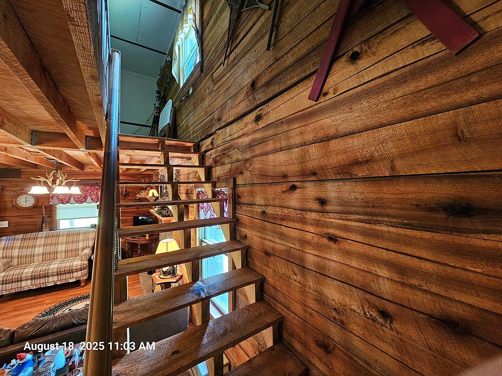 This image shows a rustic staircase leading to the upper level of a historic home. The walls are clad in warm, natural wood planks, exuding an inviting atmosphere. A blend of natural textures and finishes highlights the artisanal craftsmanship. The staircase, featuring sturdy wooden steps and a metal railing, emphasizes functionality and charm. In the background, glimpses of cozy furnishings can be seen, including a plaid sofa and decorative lighting. Color tones are earthy, with browns and warm hues enhancing the homely feel. Overall, the space reflects a harmonious balance of rustic elegance and comfort.