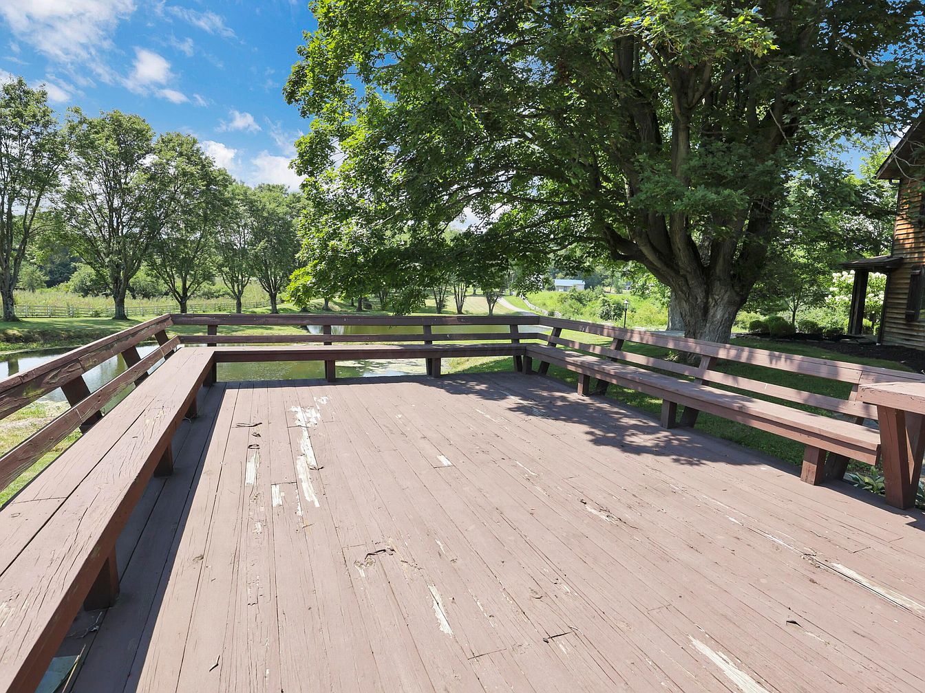 A wide, wooden deck with built-in bench seating wraps along two sides, forming an inviting outdoor space ideal for gatherings. The wood is painted a rustic brown that is weathered, with areas of peeling paint giving it a charming, lived-in look. To the right, a large mature tree provides shade, its leafy branches stretching across part of the deck. Beyond the railing, an open grassy lawn dotted with orderly rows of trees stretches away, with a tranquil pond nearby. The surrounding natural landscape offers lush greenery, conveying a peaceful and welcoming rural setting perfect for relaxation.