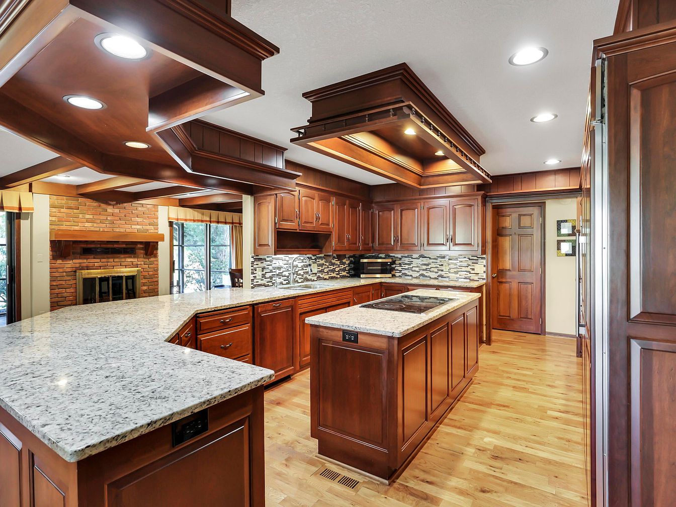 Warm wood tones dominate the spacious kitchen, with custom cabinetry and extensive wood paneling on both ceiling and walls. A large, L-shaped granite countertop offers ample workspace and seating, complemented by a central island with a built-in stovetop. Silver and gray backsplash tiles create a modern contrast against rich wooden cabinetry. Recessed lighting in the ceiling and under the wooden soffits illuminates the room evenly. The hardwood floors maintain a cohesive, warm palette. In the background, a brick fireplace and large windows with golden drapes provide a view into an adjoining living or dining area, blending classic and contemporary aesthetics.