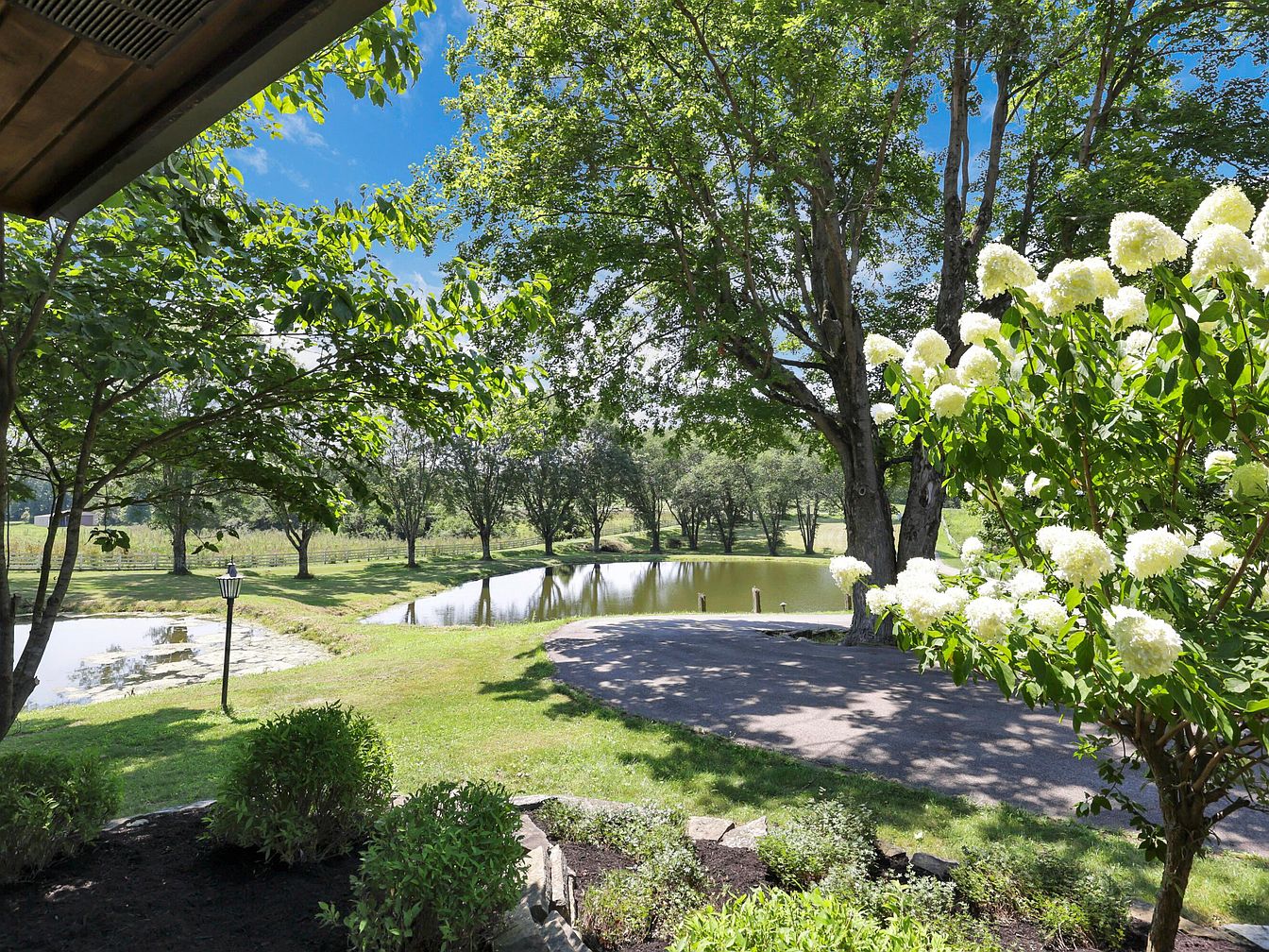 Expansive estate featuring a large, two-story historic house with a pitched roof, surrounded by mature trees and manicured landscaping. A paved driveway winds through the emerald-green lawn, leading to a spacious carport with three vehicles beneath it. To the left, a detached building with a matching tan roof sits adjacent to the main house. In the backyard, a crystal blue swimming pool and circular hot tub are framed by seating areas, with open grassy fields and a wooden fence enclosing the property. Overall, the scene exudes peaceful rural charm and offers both privacy and ample outdoor living space.