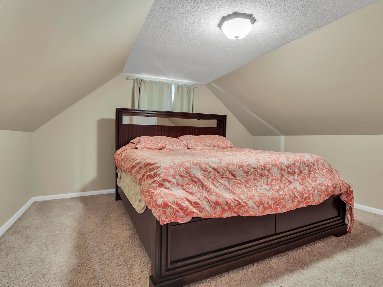 A compact attic bedroom with sloped ceilings painted a soft beige, creating a cozy, intimate setting. Walls are smooth and plain, complementing the plush, light beige carpeting underfoot. The centerpiece is a dark wood bed frame with a high headboard, featuring a peach and white patterned comforter that adds a pop of warm color. At the head of the bed, a small rectangular window is dressed with simple, cream curtains, allowing natural light to gently filter in. A flush-mount ceiling light provides illumination, blending seamlessly with the modest, understated decor.