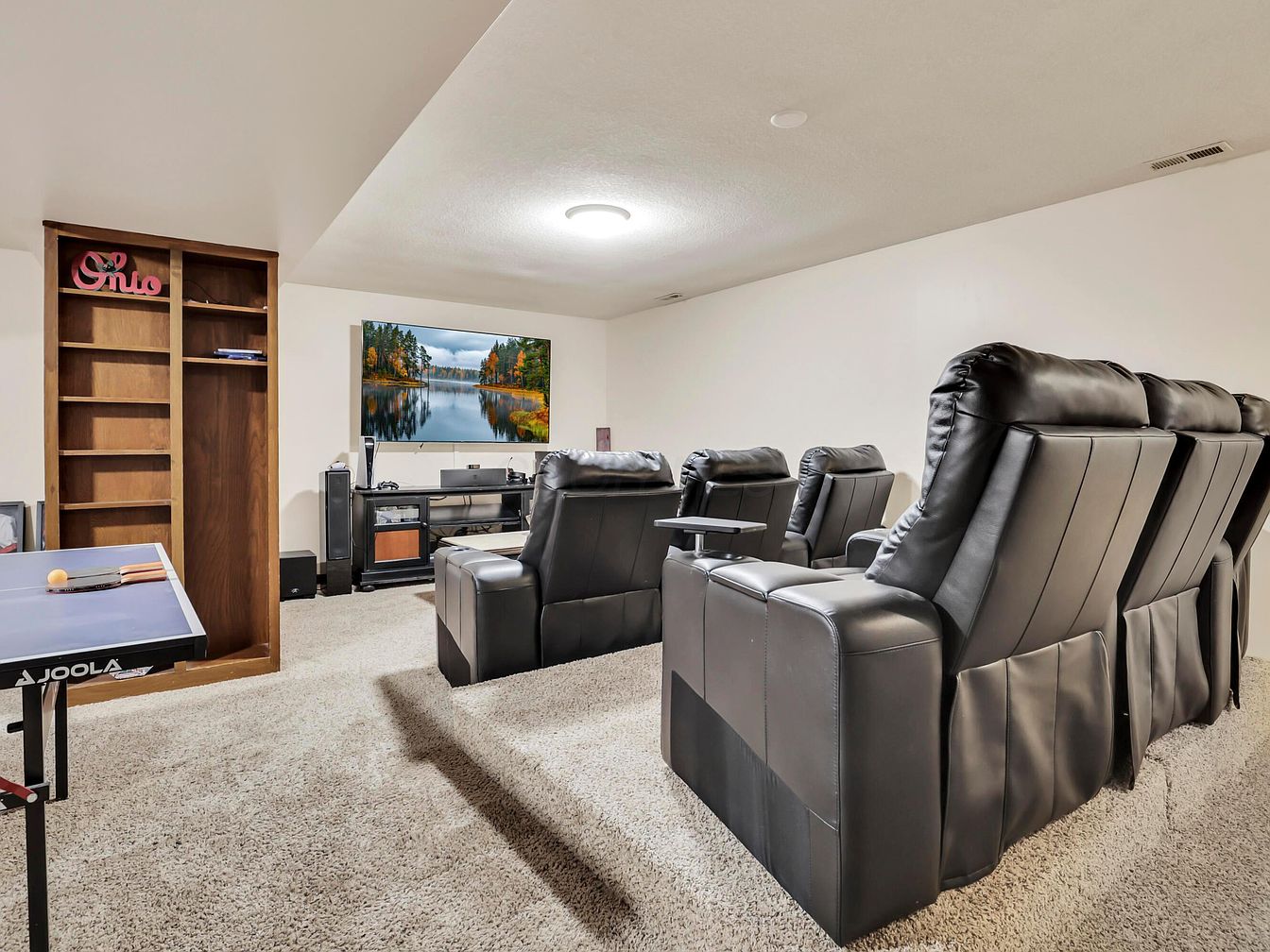 A spacious entertainment room with two rows of plush black leather recliners arranged for optimal television viewing faces a large flat-screen TV mounted on the far wall. The room is carpeted in soft beige, lending warmth and comfort to the space. Along the left side, built-in wooden shelving provides storage and display space, with a decorative pink “Ohio” sign adding a playful touch. A modern black media console beneath the TV holds various electronics and speakers, contributing to a home cinema experience. A ping pong table in the foreground emphasizes the room’s recreational purpose and family-friendly atmosphere.