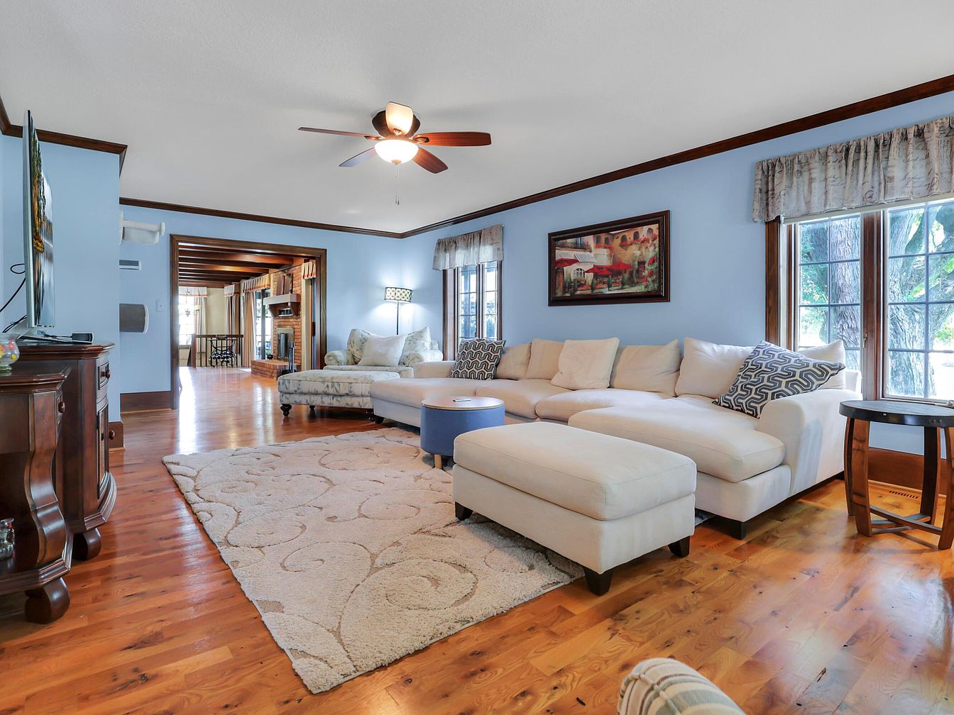 Spacious living room with soft blue walls and rich, medium-toned wood trim. Large windows bring in natural light, framed by delicate valances in greyish hues and offering a view of mature trees outside. The floor is polished hardwood with a swirling-patterned, plush cream area rug anchoring a modern, L-shaped sectional sofa in ivory, adorned with assorted throw pillows. A dark wood entertainment unit sits to the left, and a round side table balances the scene. Ceiling fan with a light fixture, wall-mounted art, and an open view into an adjoining room featuring exposed wood ceiling beams and a cozy fireplace create a warm, inviting aesthetic.