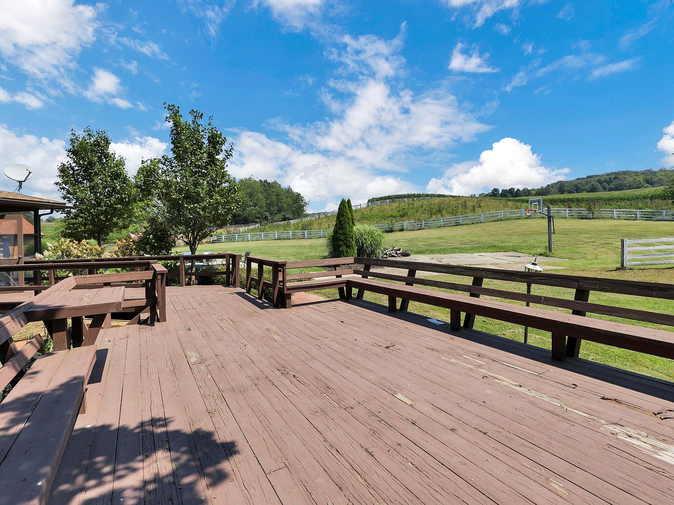 Expansive wooden deck built from weathered planks stretches out with ample bench seating along its perimeter, creating a welcoming space for gatherings. Several picnic-style tables are arranged at one end, providing a communal dining area. The deck overlooks a large, open lawn bordered by a classic wooden fence, with gently rolling hills and trees in the background. A single basketball hoop stands beside a concrete pad, hinting at recreational use. The natural palette consists of earth-toned wood, lush green grass, and a vibrant blue sky, blending rural charm with practical outdoor living.