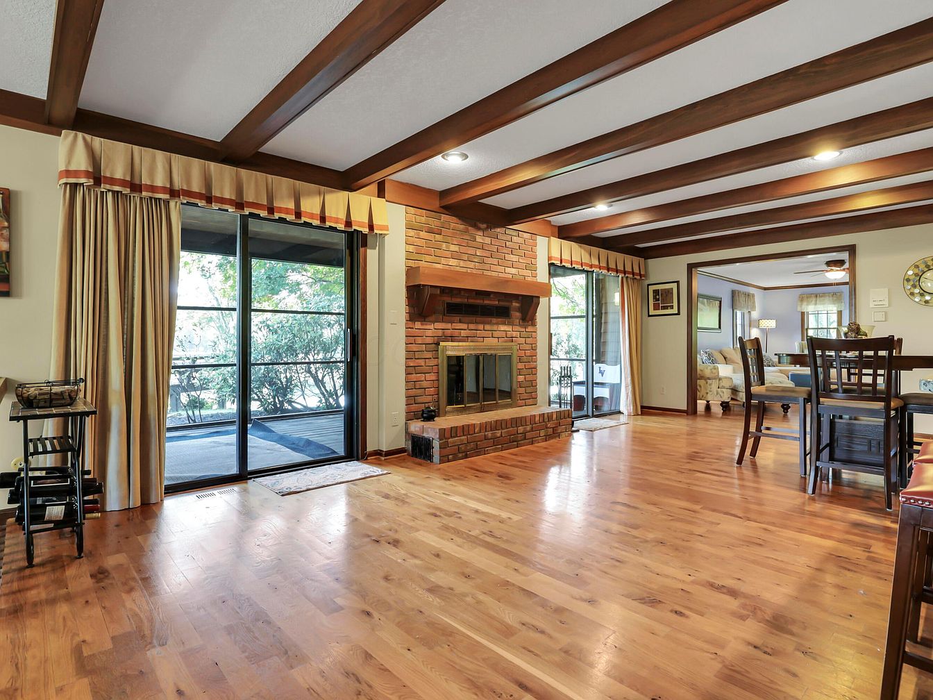 A spacious living area featuring warm wood flooring and exposed wooden ceiling beams. The focal point is a large brick fireplace with a substantial raised hearth, flanked by floor-to-ceiling sliding glass doors draped with beige curtains and a decorative valance. The room flows into a formal dining area with a dark wood table and light upholstered chairs, leading to a cozy, softly-lit sitting room with plush seating. The overall palette combines natural wood tones, brick red, cream, and caramel hues, evoking a welcoming, classic ambiance. Abundant natural light filters through large windows, highlighting the inviting and traditional American design.